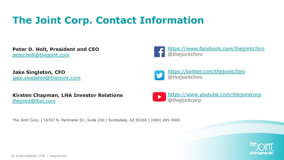 17 © 2018 | NASDAQ: JYNT | thejoint.com GAAP – Non - GAAP Reconciliation 1 1 All periods shown are restated in new accounting standards related to ASC606, which was adopted at the beginning of 2018. Q1-16 Q2-16 Q3-16 Q4-16 Q1-17 Q2-17 Q3-17 Q4-17 Q1-18 Q2-18 Q3-18 Net Income (Loss) (3,652)$ (3,255)$ (2,887)$ (6,001)$ (1,765)$ (1,022)$ (432)$ (213)$ (387)$ (43)$ (152)$ Net Interest (0) 1 (6) 9 24 24 20 11 11 11 11 Income Taxes 44 73 14 32 41 3 36 (43) (63) 6 (50) Depreciation and Amortization Expense576 637 696 658 578 503 469 467 387 405 389 EBITDA (3,033)$ (2,543)$ (2,183)$ (5,302)$ (1,123)$ (492)$ 93$ 222$ (52)$ 379$ 198$ Stock Based Compensation 198 560 255 111 95 132 185 182 208 139 123 Bargain Purchase Gain - - - - - - - - - (75) - Loss on Disposition/Impairment - - - 3,520 418 - - - - 251 343 Acquisition Expenses 31 19 14 11 13 0 - - - 3 1 Adjusted EBITDA (2,804)$ (1,965)$ (1,913)$ (1,661)$ (597)$ (360)$ 279$ 404$ 156$ 697$ 665$