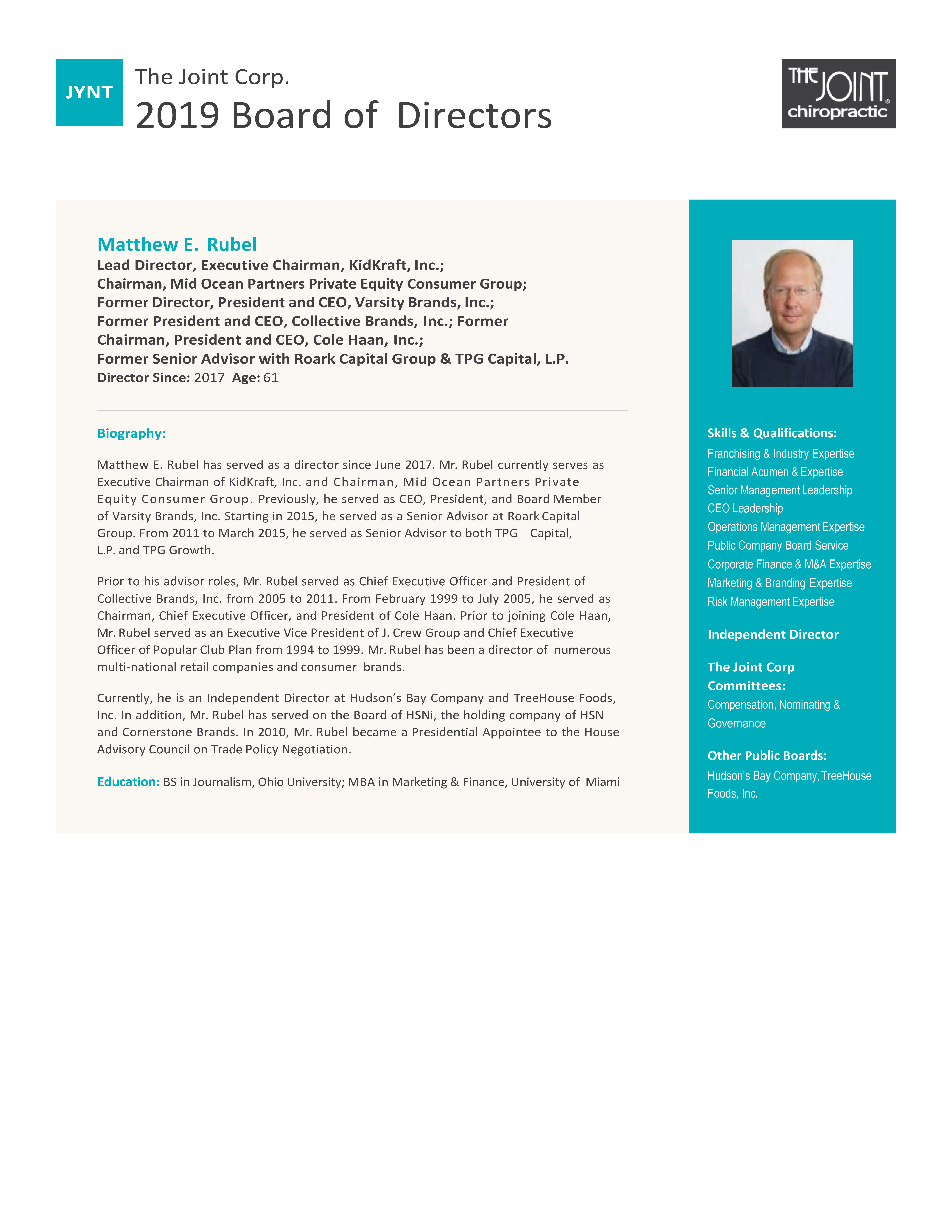 | Matthew E. Rubel | 61 | 2017 | Lead Director; current director of TreeHouse Foods, Inc.; Chairman, Mid Ocean Partners Private Equity Consumer Group; former President and CEO of Varsity Brands, Inc.; former Chairman and CEO of Collective Brands, Inc.; and Cole Haan, Inc.; former Senior Advisor with Roark Capital Group and TPG Capital, L.P.