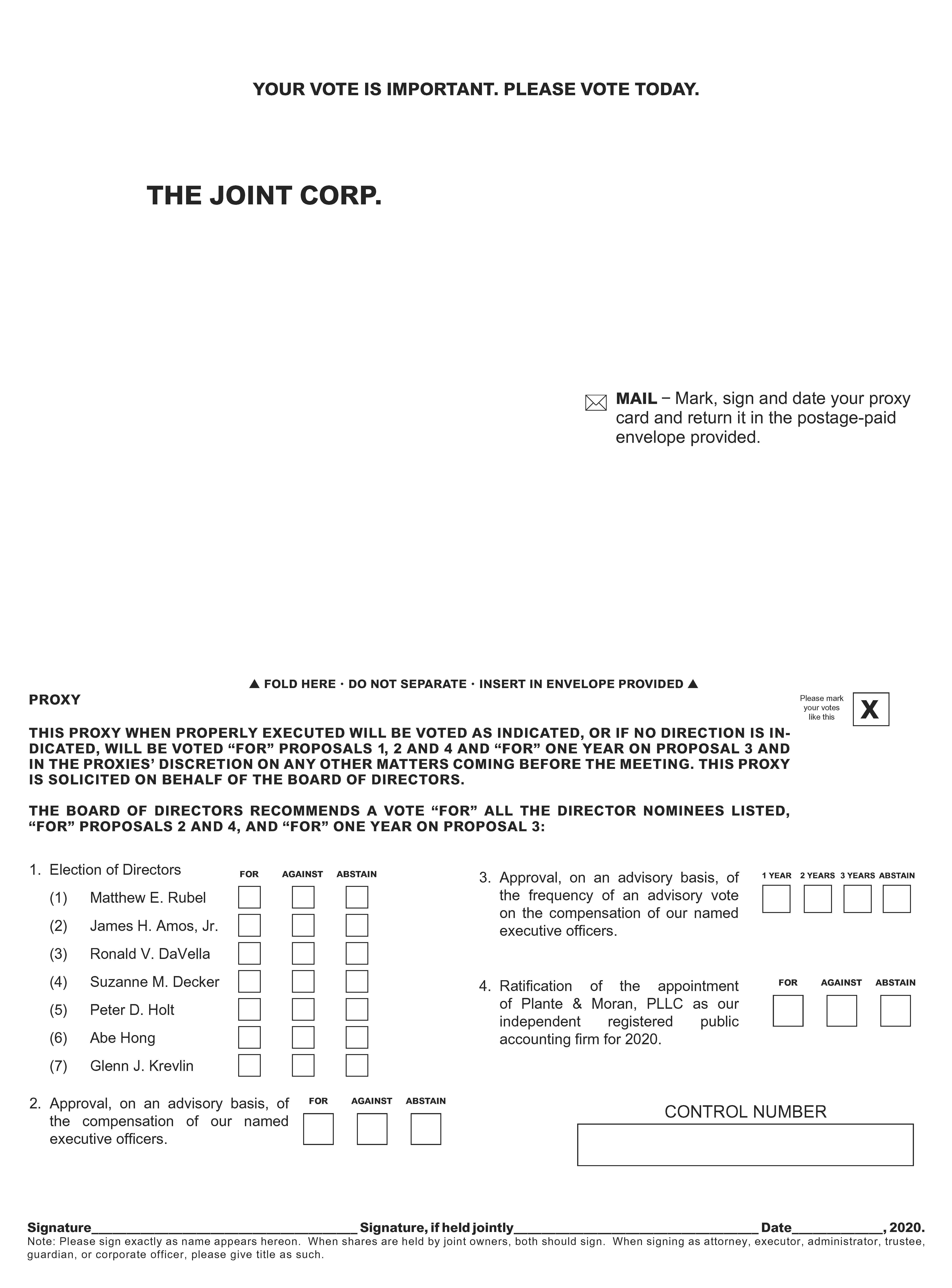 After much deliberation, the Board of the Company has decided to still hold our annual meeting as scheduled at our corporate offices in Scottsdale, Arizona. However, in light of the serious nature and health risks from the spread of COVID-19 in larger gatherings, we are taking the unusual step of asking that you seriously consider not attending the annual meeting. Therefore, we ask that you promptly return your proxy or vote electronically as described in the proxy materials provided to you. For the convenience of our stockholders of record who do not plan to attend the Annual Meeting in person, but who want their shares voted, we have enclosed a proxy card. If you do not plan to attend the Annual Meeting, please complete and return the proxy card in the envelope provided, or go to www.cstproxy.com/thejoint/2020 and follow the instructions. If you return your proxy card and later decide to attend the Annual Meeting in person, or if for any other reason you want to revoke your proxy, you may do so at any time before your proxy is voted. If you hold your shares through a broker, bank, or other nominee, please see the instructions in the General Information section on how to vote your shares, either by written instruction or in person at the meeting. Please read carefully the enclosed information and our 2019 Annual Report, which includes our Form 10-K for the year ended December 31, 2019, before voting your proxy.