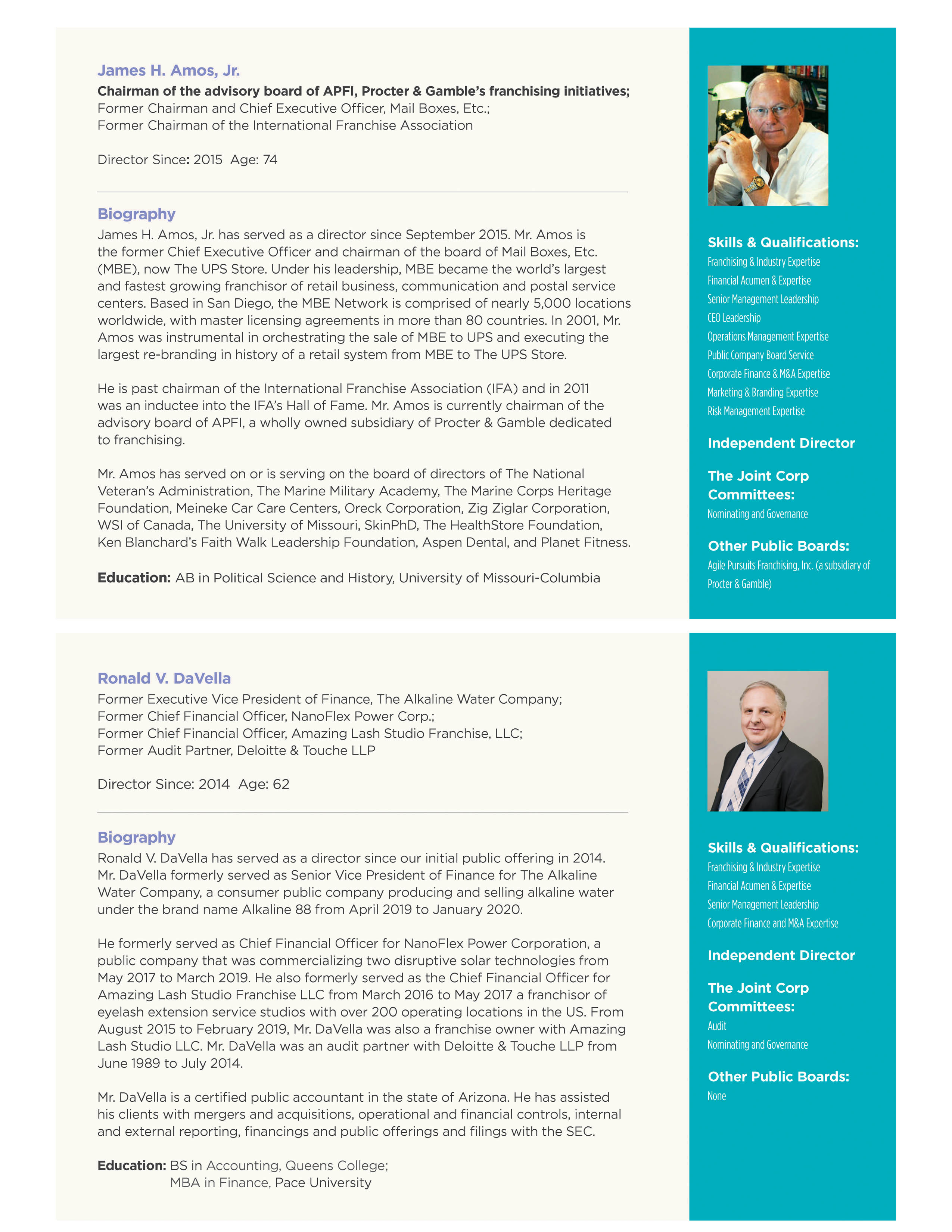 | James H. Amos, Jr. | 74 | 2015 | Current Chairman of the advisory board of APFI, Procter and Gamble’s franchising initiative; former Chairman and Chief Executive Officer of Mail Boxes, Etc.; former Chairman of the International Franchise Association | ·