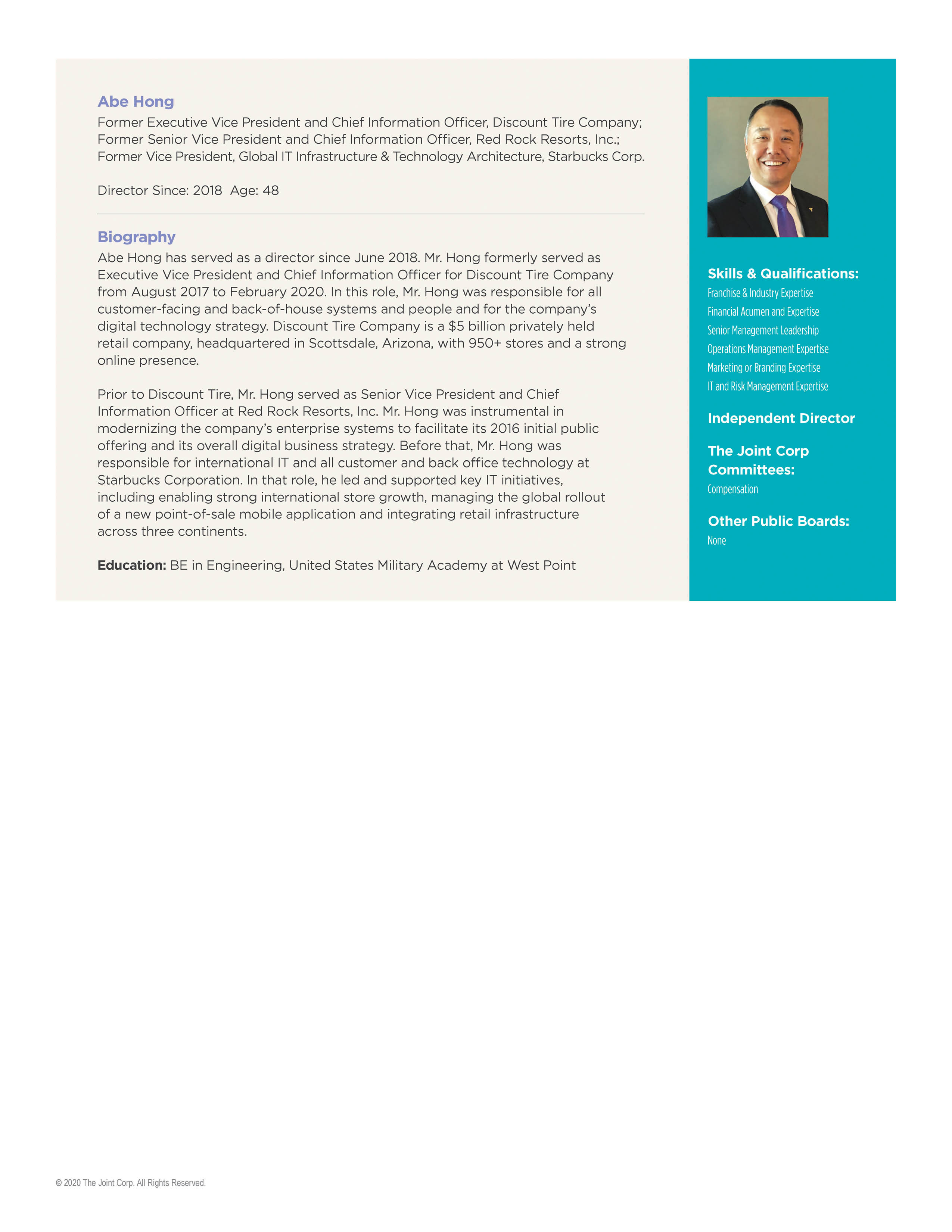 | Abe Hong | 48 | 2018 | Former Executive Vice President & Chief Information Officer at Discount Tire Company | · Compensation | ||||