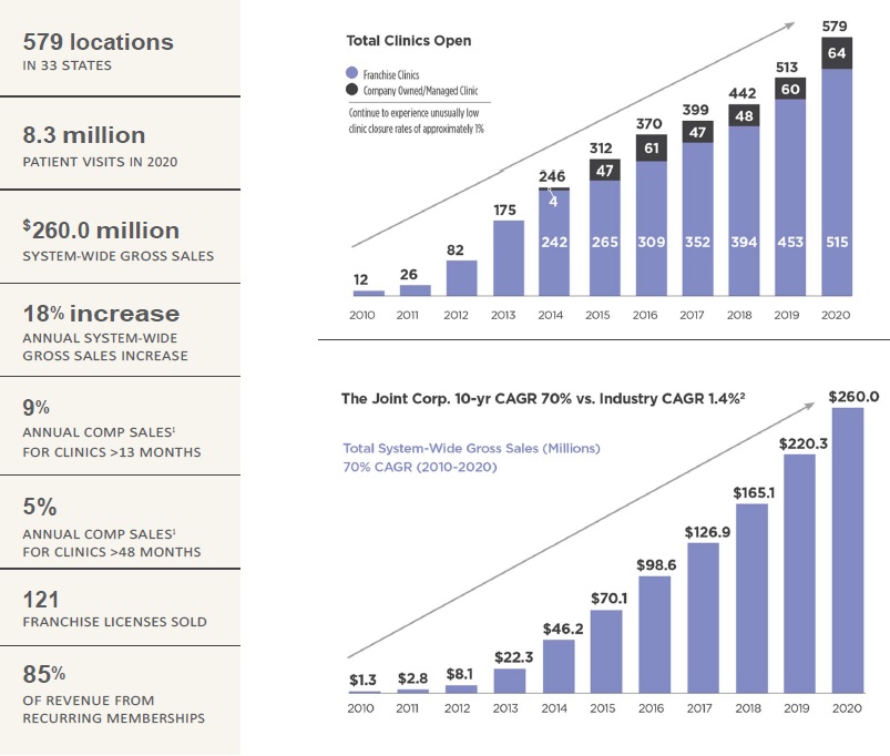 Our mission at The Joint Corp. is to improve quality of life for the patients we serve through routine and affordable chiropractic care. We are leaders of a movement to revolutionize access to chiropractic care. We deliver services through our network of retail outlets in 33 states, which approached 600 clinics at December 31, 2020, and were supported by more than 1,650 licensed doctors who performed over eight million chiropractic adjustments in 2020. Our doctors provide patient care focused on pain relief and ongoing wellness to promote healthy, active lifestyles. We are building a consumer brand, positioned on providing accessible, credible and empathetic chiropractic treatment.
