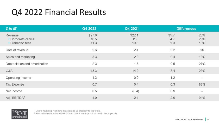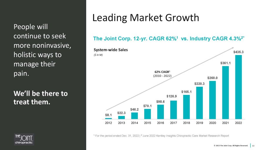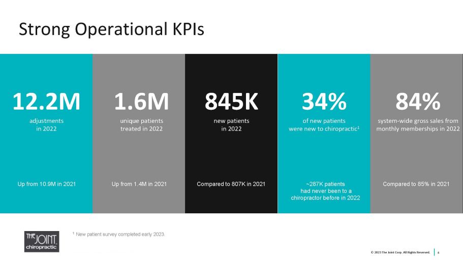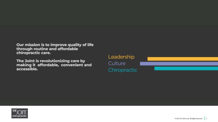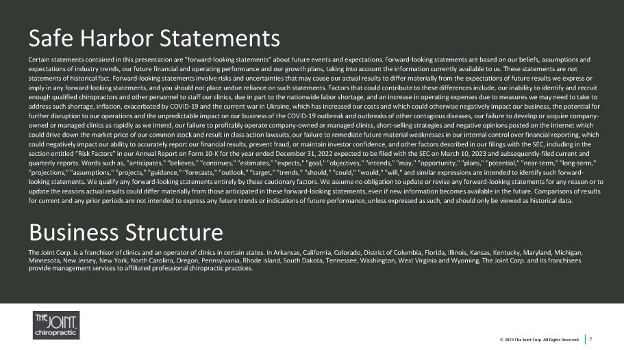 2 Safe Harbor Statements Certain statements contained in this presentation are "forward - looking statements” about future events and expectations. Forward - looking statements are based on our beliefs, assumptions and expectations of industry trends, our future financial and operating performance and our growth plans, taking into account the in formation currently available to us. These statements are not statements of historical fact. Forward - looking statements involve risks and uncertainties that may cause our actual results to d iffer materially from the expectations of future results we express or imply in any forward - looking statements, and you should not place undue reliance on such statements. Factors that could contribu te to these differences include, our inability to identify and recruit enough qualified chiropractors and other personnel to staff our clinics, due in part to the nationwide labor shortage, and an in crease in operating expenses due to measures we may need to take to address such shortage, inflation, exacerbated by COVID - 19 and the current war in Ukraine, which has increased our costs and whic h could otherwise negatively impact our business, the potential for further disruption to our operations and the unpredictable impact on our business of the COVID - 19 outbreak and outbreaks of othe r contagious diseases, our failure to develop or acquire company - owned or managed clinics as rapidly as we intend, our failure to profitably operate company - owned or managed clinics, short - sell ing strategies and negative opinions posted on the internet which could drive down the market price of our common stock and result in class action lawsuits, our failure to remediate future ma ter ial weaknesses in our internal control over financial reporting, which could negatively impact our ability to accurately report our financial results, prevent fraud, or maintain investor confidenc e, and other factors described in our filings with the SEC, including in the section entitled “Risk Factors” in our Annual Report on Form 10 - K for the year ended December 31, 2022 expected to be filed with the SEC on March 10, 2023 and subsequently - filed current and quarterly reports. Words such as, "anticipates," "believes," "continues," "estimates," "expects," "goal," "objectives," "inte nds ," "may," "opportunity," "plans," "potential," "near - term," "long - term," "projections," "assumptions," "projects," "guidance," "forecasts," "outlook," "target," "trends," "should," "could," "would," "w ill," and similar expressions are intended to identify such forward - looking statements. We qualify any forward - looking statements entirely by these cautionary factors. We assume no obligation to u pdate or revise any forward - looking statements for any reason or to update the reasons actual results could differ materially from those anticipated in these forward - looking statements, even if ne w information becomes available in the future. Comparisons of results for current and any prior periods are not intended to express any future trends or indications of future performance, unless exp ressed as such, and should only be viewed as historical data. Business Structure The Joint Corp. is a franchisor of clinics and an operator of clinics in certain states. In Arkansas, California, Colorado, D ist rict of Columbia, Florida, Illinois, Kansas, Kentucky, Maryland, Michigan, Minnesota, New Jersey, New York, North Carolina, Oregon, Pennsylvania, Rhode Island, South Dakota, Tennessee, Washington, Wes t V irginia and Wyoming, The Joint Corp. and its franchisees provide management services to affiliated professional chiropractic practices. © 2023 The Joint Corp. All Rights Reserved.