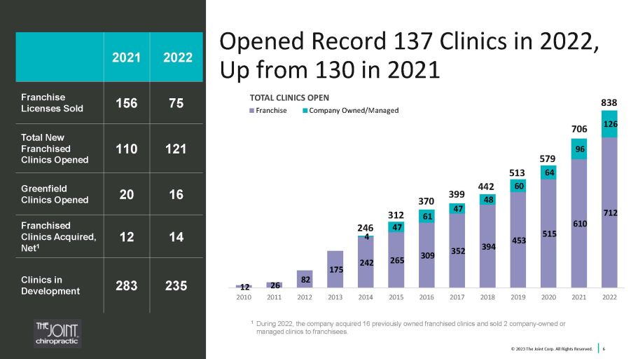 Accelerating Momentum Closing 2022 5 2022 2021 Revenue $101.9M $80.9M Operating Income $2.1M $5.4M Net Income $1.2M $6.6M Adjusted EBITDA 2 $11.5M $12.6M Unrestricted cash $9.7M at Dec. 31, 2022, compared to $19.5 M at Dec. 31, 2021, reflecting continued investment strategy © 2022 The Joint Corp. All Rights Reserved. 1 Comparable sales include only the sales from clinics that have been open at least 13 or 48 full months and exclude any clinics that have permanently closed. 2 Reconciliation of Adjusted EBITDA to GAAP earnings is included in the Appendix. 5 21 % Increase in system - wide sales 2022 over 2021 9% In crease in comp sales 1 for all clinics >13 months in operation 2022 over 2021 4 % In crease in comp sales 1 for all clinics >48 months in operation 2022 over 2021 © 2023 The Joint Corp. All Rights Reserved.