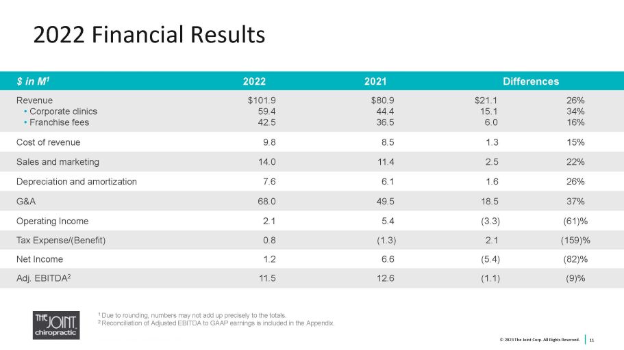 Q4 2022 Financial Results 10 $ in M 1 Q4 2022 Q4 2021 Differences Revenue • Corporate clinics • Franchise fees $27.8 16.5 11.3 $22.1 11.8 10.3 $5.7 4.7 1.0 26% 20% 13% Cost of revenue 2.6 2.4 0.2 8% Sales and marketing 3.3 2.9 0.4 13% Depreciation and amortization 2.3 1.8 0.5 27% G&A 18.3 14.9 3.4 23% Operating Income 1.3 0.0 1.2 - Tax Expense 0.7 0.4 0.3 88% Net Income 0.5 (0.4) 0.9 - Adj. EBITDA 2 4.0 2.1 2.0 91% 1 Due to rounding, numbers may not add up precisely to the totals. 2 Reconciliation of Adjusted EBITDA to GAAP earnings is included in the Appendix. © 2023 The Joint Corp. All Rights Reserved.