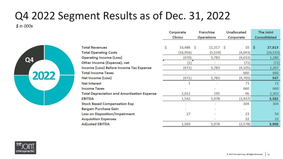 Performance Metrics and Non - GAAP Measures 17 This presentation includes commonly discussed performance metrics. System - wide sales include sales at all clinics, whether operated by the company or by franchisees. While franchised sales are not recorded as revenues by the company, management believes the information is impor tan t in understanding the company’s financial performance, because these sales are the basis on which the company calculates and records royalty fees a nd are indicative of the financial health of the franchisee base. Comp sales include the sales from both company - owned or managed clinics and franchised clinics that in each case have been open at least 13 full months and exclude any clinics that have closed. This presentation includes non - GAAP financial measures. EBITDA and Adjusted EBITDA are presented because they are important measures used by management to assess financial performance, as management believes they provide a more transparent view of the Company’s underlying operating performance and operating trends than GAAP measures alone. Reconciliations of net loss to EBITDA and Adjusted EBITDA are pres ent ed where applicable. The Company defines EBITDA as net income/(loss) before net interest, tax expense, depreciation, and amortization expenses. Th e C ompany defines Adjusted EBITDA as EBITDA before acquisition - related expenses, bargain purchase net gain, gain/(loss) on disposition or impairment, and stock - based compensation expenses. EBITDA and Adjusted EBITDA do not represent and should not be considered alternatives to net income or cash flows from operat ion s, as determined by accounting principles generally accepted in the United States, or GAAP. While EBITDA and Adjusted EBITDA are frequently used as measures of financial performance and the ability to meet debt service requirements, they are not necessarily comparable to other similarly titled cap tions of other companies due to potential inconsistencies in the methods of calculation. EBITDA and Adjusted EBITDA should be reviewed in conjunction with th e Company’s financial statements filed with the SEC. © 2023 The Joint Corp. All Rights Reserved.