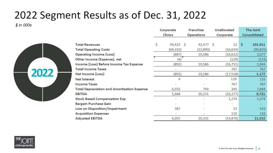 Q4 2022 Segment Results as of Dec. 31, 2022 18 2022 Q4 © 2022 The Joint Corp. All Rights Reserved. $ in 000s © 2023 The Joint Corp. All Rights Reserved.