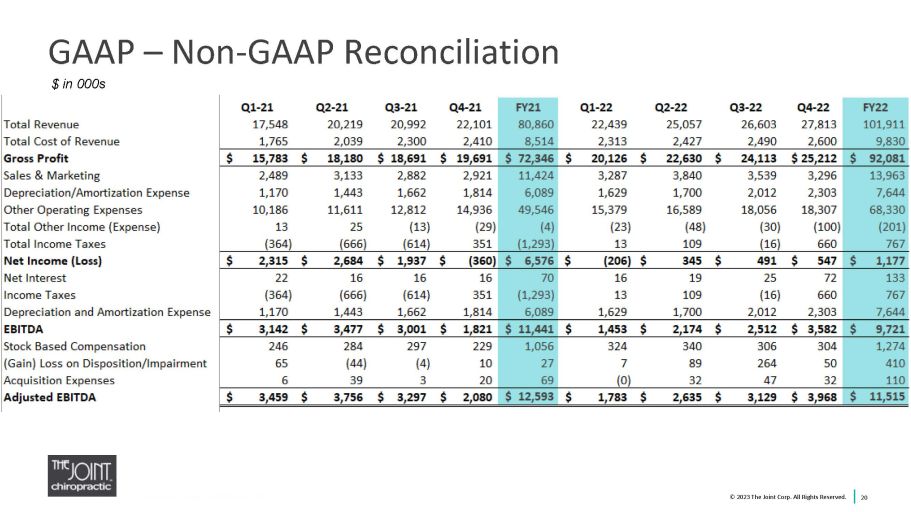 GAAP – Non - GAAP Reconciliation 20 $ in 000s © 2023 The Joint Corp. All Rights Reserved.