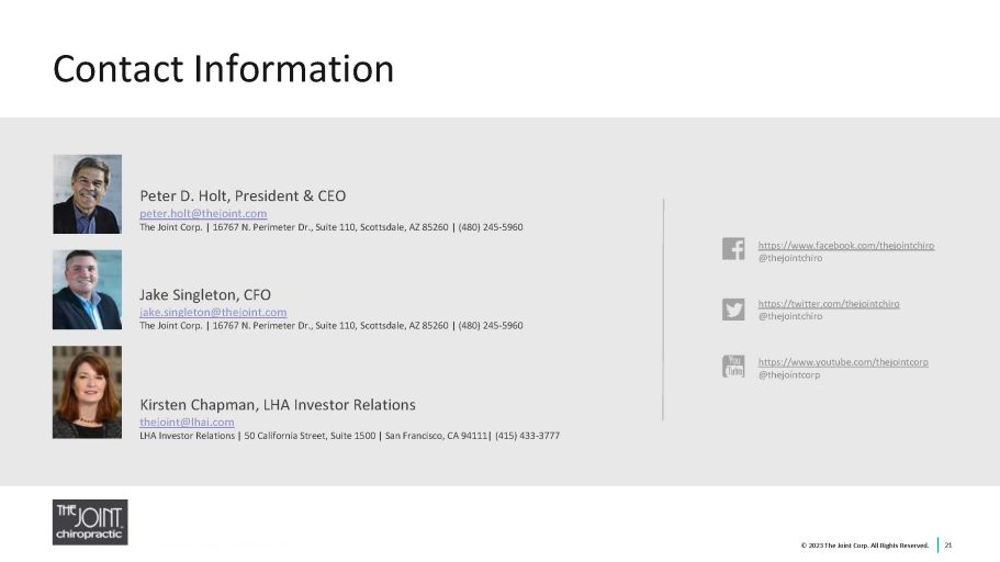 Jake Singleton, CFO jake.singleton@thejoint.com The Joint Corp. | 16767 N. Perimeter Dr., Suite 110, Scottsdale, AZ 85260 | (480) 245 - 5960 https://www.facebook.com/thejointchiro @thejointchiro https://twitter.com/thejointchiro @thejointchiro https://www.youtube.com/thejointcorp @thejointcorp Peter D. Holt, President & CEO peter.holt@thejoint.com The Joint Corp. | 16767 N. Perimeter Dr., Suite 110, Scottsdale, AZ 85260 | (480) 245 - 5960 Kirsten Chapman, LHA Investor Relations thejoint@lhai.com LHA Investor Relations | 50 California Street, Suite 1500 | San Francisco, CA 94111| (415) 433 - 3777 Contact Information 21 © 2023 The Joint Corp. All Rights Reserved.