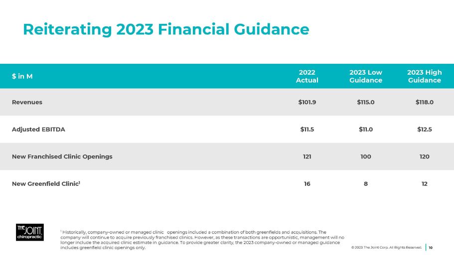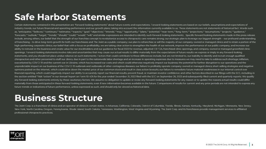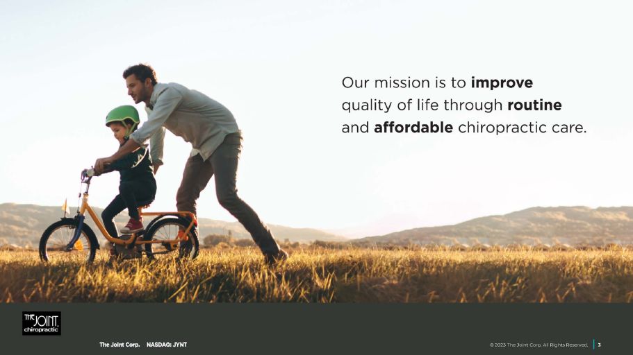 Safe Harbor Statements © 2023 The Joint Corp. All Rights Reserved. 2 Certain statements contained in this presentation are "forward - looking statements” about future events and expectations. Forward - looking statements are based on our beliefs, assumptions and expectations of industry trends, our future financial and operating performance and our growth plans, taking into account the information currently available to us. These statements are not statements of historical fact. Words such as, "anticipates," "believes," "continues," "estimates," "expects," "goal," "objectives," "intends," "may," "opportunity," "plans," "potential," "near - term," "long - term," "projections," "assumptions," "projects," "guidance," "forecasts," "outlook," "target," "trends," "should," "could," "would," "will," and similar expressions are intended to identify such forward - looking statements. . Specific forward looking statements made in this press release include, among others, our belief that the strength of our franchise concept to revolutionize access to chiropractic care remains strong; our strategic plan to leverage our biggest strength – our profound understanding of franchising – to drive long - term growth for both our franchisees and The Joint as a public company; our plan to refranchise or sell the majority of our company - owned or managed clinics and to retain a portion of the high - performing corporate clinics; our belief that with a focus on profitability, we are taking clear action to strengthen the health of our network, improve the performance of our public company, and increase our ability to reinvest in the business and create value for our stockholders; and our guidance for fiscal 2023 for revenue, adjusted EBITDA, franchised clinic openings, and company - owned or managed greenfield clinic openings. Forward - looking statements involve risks and uncertainties that may cause our actual results to differ materially from the expectations of future results we express or imply in any forward - looking statements, and you should not place undue reliance on such statements. Factors that could contribute to these differences include, but are not limited to, our inability to identify and recruit enough qualified chiropractors and other personnel to staff our clinics, due in part to the nationwide labor shortage and an increase in operating expenses due to measures we may need to take to address such shortage; inflation, exacerbated by COVID - 19 and the current war in Ukraine, which has increased our costs and which could otherwise negatively impact our business; the potential for further disruption to our operations and the unpredictable impact on our business of the COVID - 19 outbreak and outbreaks of other contagious diseases; our failure to profitably operate company - owned or managed clinics; short - selling strategies and negative opinions posted on the internet, which could drive down the market price of our common stock and result in class action lawsuits; our failure to remediate future material weaknesses in our internal control over financial reporting, which could negatively impact our ability to accurately report our financial results, prevent fraud, or maintain investor confidence; and other factors described in our filings with the SEC, including in the section entitled “Risk Factors” in our Annual Report on Form 10 - K/A for the year ended December 31, 2022 filed with the SEC on September 26, 2023 and subsequently - filed current and quarterly reports. We qualify any forward - looking statements entirely by these cautionary factors. We assume no obligation to update or revise any forward - looking statements for any reason or to update the reasons actual results could differ materially from those anticipated in these forward - looking statements, even if new information becomes available in the future. Comparisons of results for current and any prior periods are not intended to express any future trends or indications of future performance, unless expressed as such, and should only be viewed as historical data. Business Structure The Joint Corp. is a franchisor of clinics and an operator of clinics in certain states. In Arkansas, California, Colorado, District of Columbia, Florida, Illinois, Kansas, Kentucky, Maryland, Michigan, Minnesota, New Jersey, New York, North Carolina, Oregon, Pennsylvania, Rhode Island, South Dakota, Tennessee, Washington, West Virginia and Wyoming. The Joint Corp. and its franchisees provide management services to affiliated professional chiropractic practices.