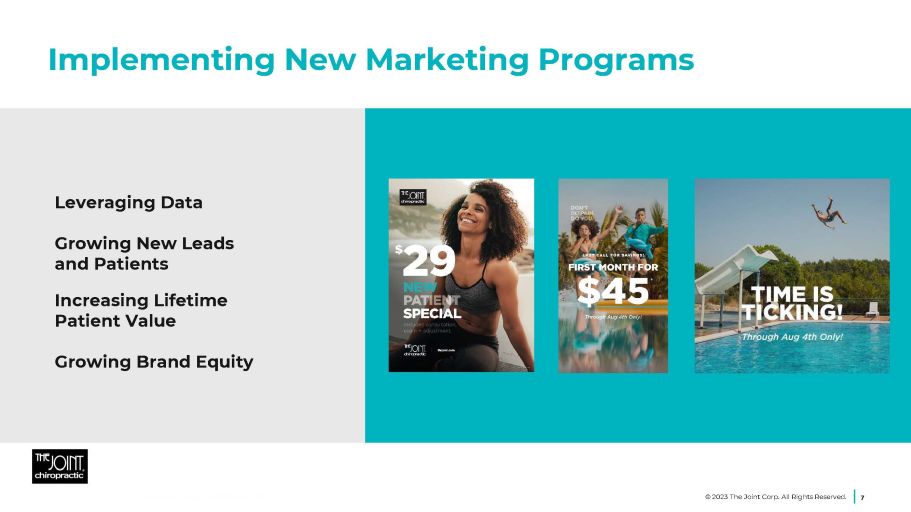RD territories cover 55% of Metropolitan Statistical Areas (MSAs) as of Sept. 30, 2023 68% of clinics supported by 17 RDs as of Sept. 30, 2023 52% sold by Regional Developers in YTD 2023 37 99 126 121 156 75 50 Dec. 31, Dec. 31, Dec. 31, Dec. 31, Dec. 31, Dec. 31,Sept. 30, 2017 2018 2019 2020 2021 2022 2023 616 715 841 962 1118 1193 1243 Dec. 31, Dec. 31, Dec. 31, Dec. 31, Dec. 31, Dec. 31,Sept. 30, 2017 2018 2019 2020 2021 2022 2023 112 155 204 253 283 235 202 Dec. 31, Dec. 31, Dec. 31, Dec. 31, Dec. 31, Dec. 31, Sept. 30, 2017 2018 2019 2020 2021 2022 2023 Pipeline for Growth 6 1 Of the 1,243 franchise licenses sold as of Sept. 30, 2023, 202 are in active development, 778 are currently operating and the balance represents terminated/closed licenses. Gross Cumulative Franchise Licenses Sold 1 Franchise Licenses Sold Annually Clinics in Active Development 1 © 2023 The Joint Corp. All Rights Reserved.