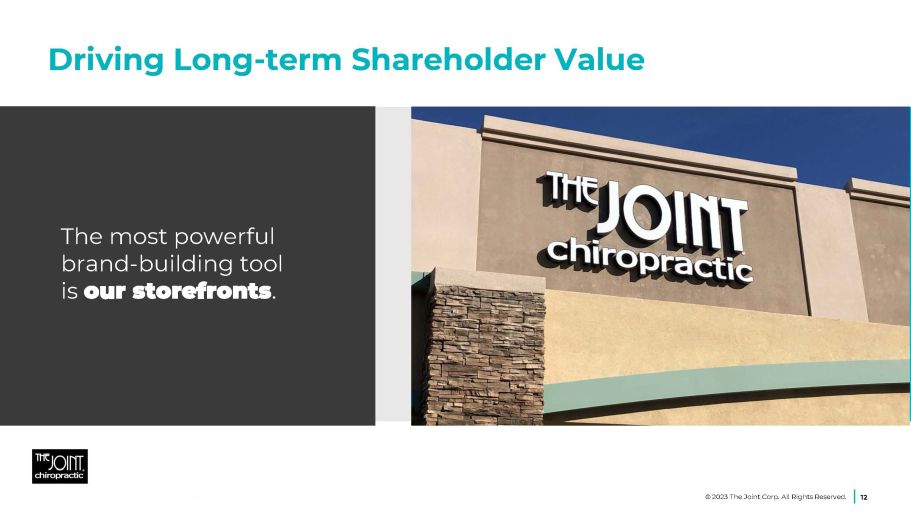 Driving Long - term Shareholder Value The most powerful brand - building tool is our storefronts . © 2023 The Joint Corp. All Rights Reserved. 12