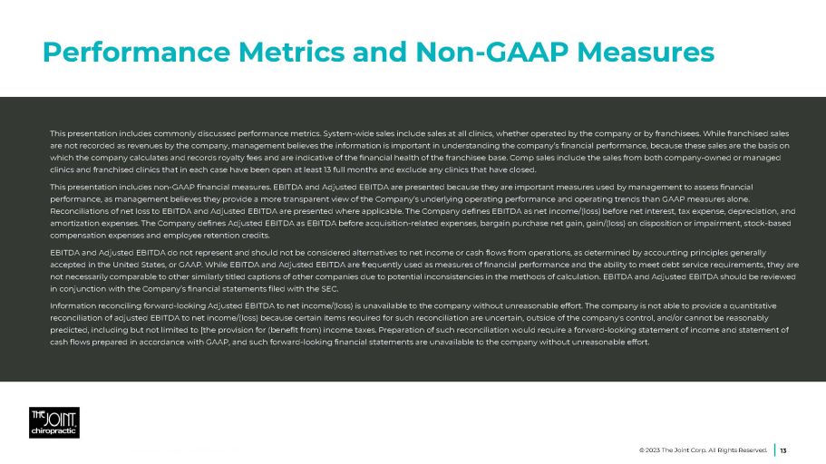 Performance Metrics and Non - GAAP Measures © 2023 The Joint Corp. All Rights Reserved. 13 This presentation includes commonly discussed performance metrics. System - wide sales include sales at all clinics, whether operated by the company or by franchisees. While franchised sales are not recorded as revenues by the company, management believes the information is important in understanding the company’s financial performance, because these sales are the basis on which the company calculates and records royalty fees and are indicative of the financial health of the franchisee base. Comp sales include the sales from both company - owned or managed clinics and franchised clinics that in each case have been open at least 13 full months and exclude any clinics that have closed. This presentation includes non - GAAP financial measures. EBITDA and Adjusted EBITDA are presented because they are important measures used by management to assess financial performance, as management believes they provide a more transparent view of the Company’s underlying operating performance and operating trends than GAAP measures alone. Reconciliations of net loss to EBITDA and Adjusted EBITDA are presented where applicable. The Company defines EBITDA as net income/(loss) before net interest, tax expense, depreciation, and amortization expenses. The Company defines Adjusted EBITDA as EBITDA before acquisition - related expenses, bargain purchase net gain, gain/(loss) on disposition or impairment, stock - based compensation expenses and employee retention credits. EBITDA and Adjusted EBITDA do not represent and should not be considered alternatives to net income or cash flows from operations, as determined by accounting principles generally accepted in the United States, or GAAP. While EBITDA and Adjusted EBITDA are frequently used as measures of financial performance and the ability to meet debt service requirements, they are not necessarily comparable to other similarly titled captions of other companies due to potential inconsistencies in the methods of calculation. EBITDA and Adjusted EBITDA should be reviewed in conjunction with the Company’s financial statements filed with the SEC. Information reconciling forward - looking Adjusted EBITDA to net income/(loss) is unavailable to the company without unreasonable effort. The company is not able to provide a quantitative reconciliation of adjusted EBITDA to net income/(loss) because certain items required for such reconciliation are uncertain, outside of the company's control, and/or cannot be reasonably predicted, including but not limited to [the provision for (benefit from) income taxes. Preparation of such reconciliation would require a forward - looking statement of income and statement of cash flows prepared in accordance with GAAP, and such forward - looking financial statements are unavailable to the company without unreasonable effort.