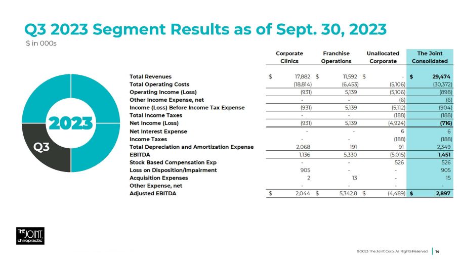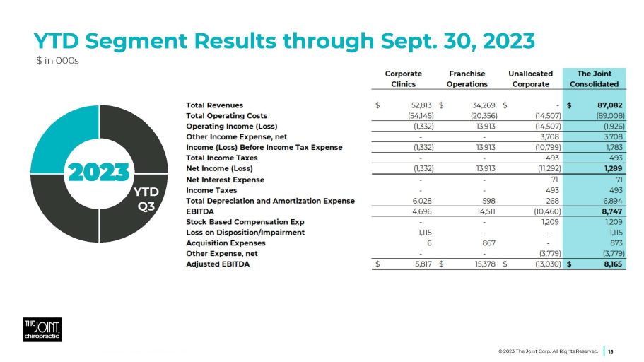 Q3 2023 Segment Results as of Sept. 30, 2023 $ in 000s 2023 Q3 © 2023 The Joint Corp. All Rights Reserved. 14