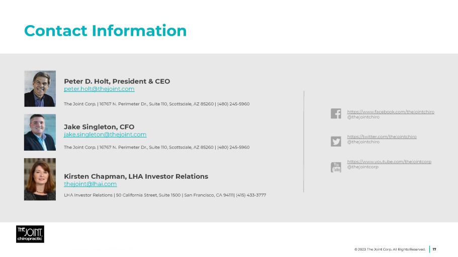 Jake Singleton, CFO jake.singleton@thejoint.com The Joint Corp. | 16767 N. Perimeter Dr., Suite 110, Scottsdale, AZ 85260 | (480) 245 - 5960 https://www.facebook.com/thejointchiro @thejointchiro © 2023 The Joint Corp. All Rights Reserved. 17 https://twitter.com/thejointchiro @thejointchiro https://www.youtube.com/thejointcorp @thejointcorp Peter D. Holt, President & CEO peter.holt@thejoint.com The Joint Corp. | 16767 N. Perimeter Dr., Suite 110, Scottsdale, AZ 85260 | (480) 245 - 5960 Kirsten Chapman, LHA Investor Relations thejoint@lhai.com LHA Investor Relations | 50 California Street, Suite 1500 | San Francisco, CA 94111| (415) 433 - 3777 Contact Information