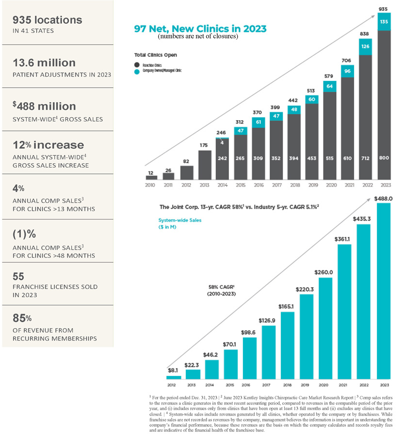 • We have the market opportunity: The Joint is the category creator and leader in capturing the $8.1 billion out-of-pocket segment of the $20.5 billion and growing franchised chiropractic care industry. • We have the team: Our dedicated doctors and wellness coordinators as well as our dynamic franchisees and regional developers consistently lead The Joint in winning numerous franchise awards. • We have the assets: Our premier nationwide brand and clinic network combined with the largest digital footprint in the industry are attracting hundreds of thousands of patients new to chiropractic care annually. • We have the business model: Our capital-lite franchise concept has been tried and tested since 2010 and consistently delivers around 85% recurring revenue. • And, we have the strategy: In the second half of 2023, we began implementing enhanced marketing initiatives to bolster new patient counts and increase existing patient engagement and later in the year, we introduced our plan to refranchise the vast majority of our corporate portfolio to increase number of franchises and to improve our profitability.