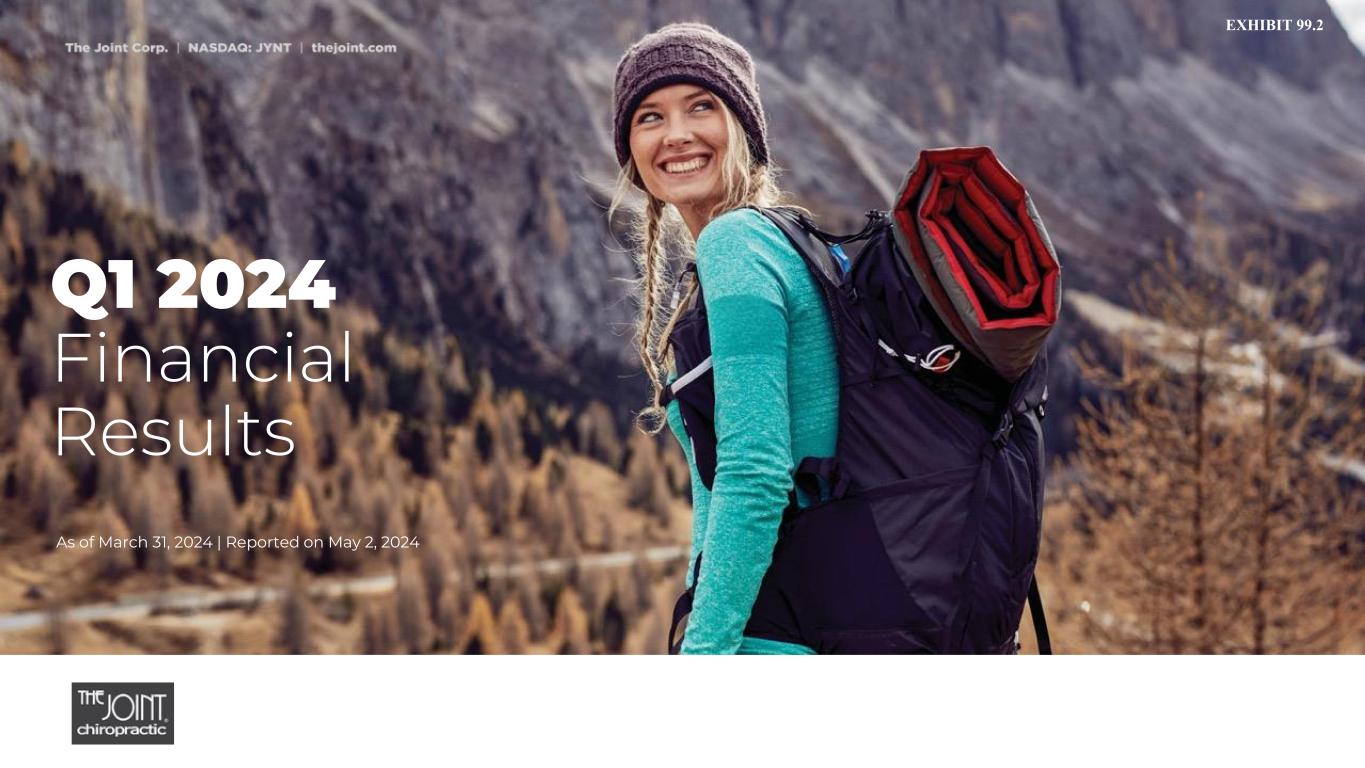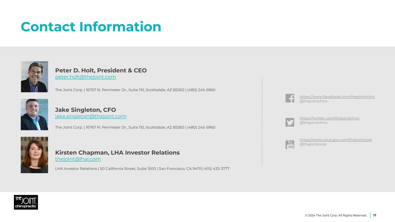 Jake Singleton, CFO jake.singleton@thejoint.com The Joint Corp. | 16767 N. Perimeter Dr., Suite 110, Scottsdale, AZ 85260 | (480) 245-5960 https://www.facebook.com/thejointchiro @thejointchiro https://twitter.com/thejointchiro @thejointchiro https://www.youtube.com/thejointcorp @thejointcorp Peter D. Holt, President & CEO peter.holt@thejoint.com The Joint Corp. | 16767 N. Perimeter Dr., Suite 110, Scottsdale, AZ 85260 | (480) 245-5960 Kirsten Chapman, LHA Investor Relations thejoint@lhai.com LHA Investor Relations | 50 California Street, Suite 1500 | San Francisco, CA 94111| (415) 433-3777 Contact Information 17© 2024 The Joint Corp. All Rights Reserved.