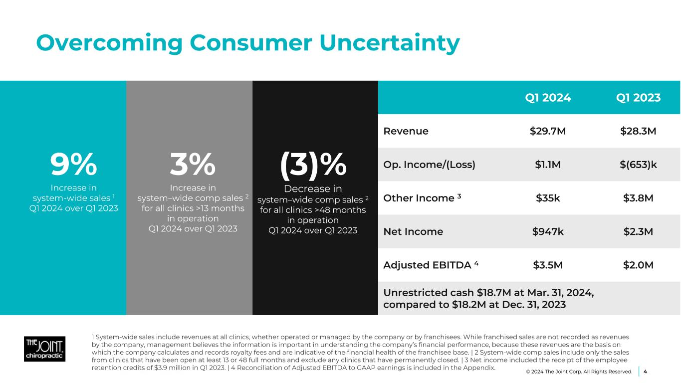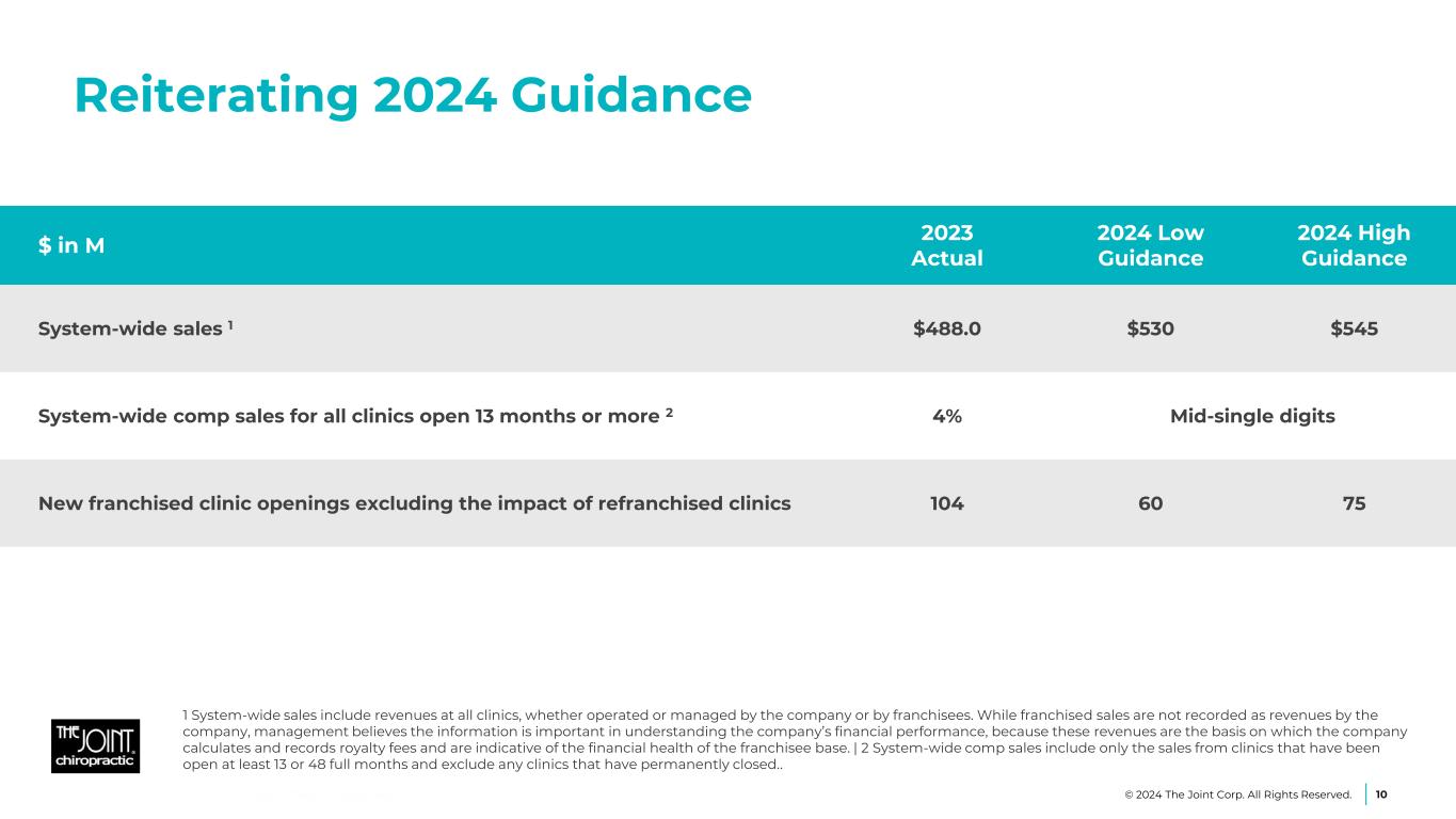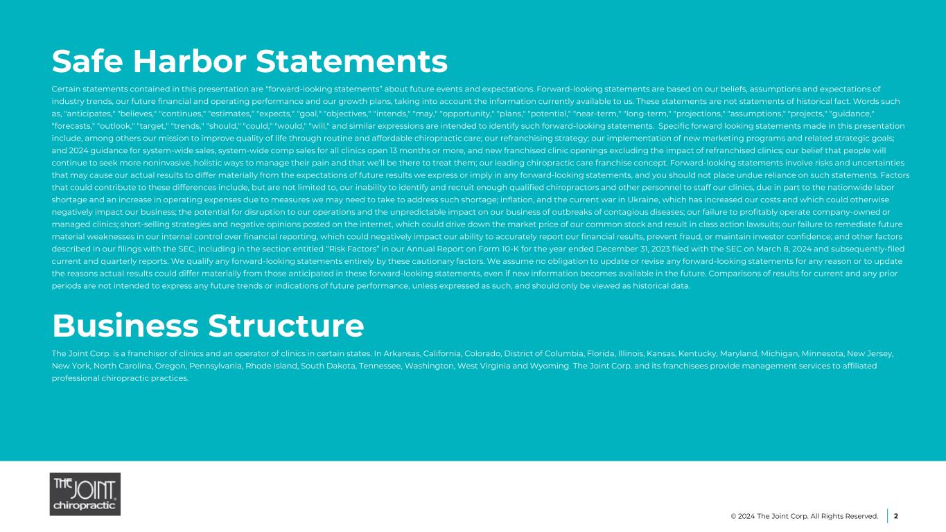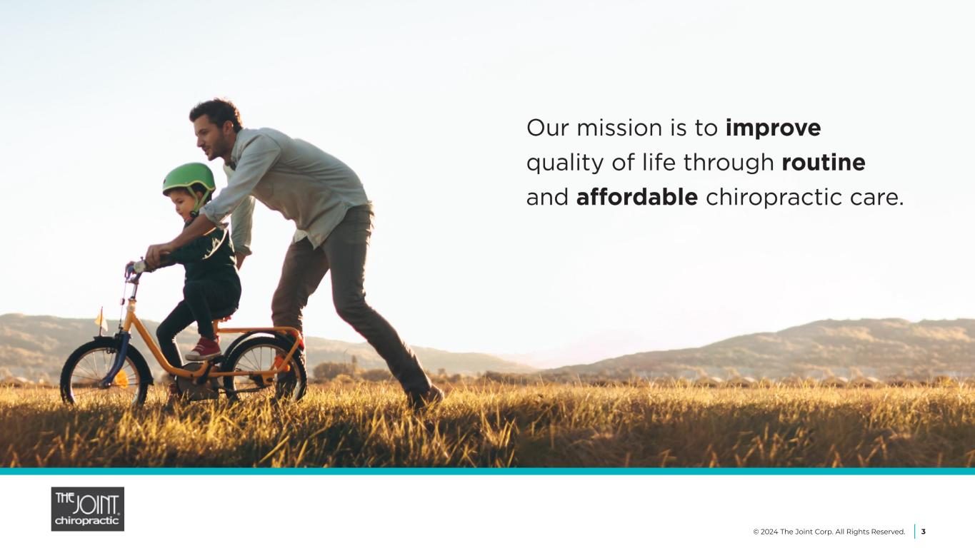 Safe Harbor Statements Certain statements contained in this presentation are "forward-looking statements” about future events and expectations. Forward-looking statements are based on our beliefs, assumptions and expectations of industry trends, our future financial and operating performance and our growth plans, taking into account the information currently available to us. These statements are not statements of historical fact. Words such as, "anticipates," "believes," "continues," "estimates," "expects," "goal," "objectives," "intends," "may," "opportunity," "plans," "potential," "near-term," "long-term," "projections," "assumptions," "projects," "guidance," "forecasts," "outlook," "target," "trends," "should," "could," "would," "will," and similar expressions are intended to identify such forward-looking statements. Specific forward looking statements made in this presentation include, among others our mission to improve quality of life through routine and affordable chiropractic care; our refranchising strategy; our implementation of new marketing programs and related strategic goals; and 2024 guidance for system-wide sales, system-wide comp sales for all clinics open 13 months or more, and new franchised clinic openings excluding the impact of refranchised clinics; our belief that people will continue to seek more noninvasive, holistic ways to manage their pain and that we’ll be there to treat them; our leading chiropractic care franchise concept. Forward-looking statements involve risks and uncertainties that may cause our actual results to differ materially from the expectations of future results we express or imply in any forward-looking statements, and you should not place undue reliance on such statements. Factors that could contribute to these differences include, but are not limited to, our inability to identify and recruit enough qualified chiropractors and other personnel to staff our clinics, due in part to the nationwide labor shortage and an increase in operating expenses due to measures we may need to take to address such shortage; inflation, and the current war in Ukraine, which has increased our costs and which could otherwise negatively impact our business; the potential for disruption to our operations and the unpredictable impact on our business of outbreaks of contagious diseases; our failure to profitably operate company-owned or managed clinics; short-selling strategies and negative opinions posted on the internet, which could drive down the market price of our common stock and result in class action lawsuits; our failure to remediate future material weaknesses in our internal control over financial reporting, which could negatively impact our ability to accurately report our financial results, prevent fraud, or maintain investor confidence; and other factors described in our filings with the SEC, including in the section entitled “Risk Factors” in our Annual Report on Form 10-K for the year ended December 31, 2023 filed with the SEC on March 8, 2024 and subsequently-filed current and quarterly reports. We qualify any forward-looking statements entirely by these cautionary factors. We assume no obligation to update or revise any forward-looking statements for any reason or to update the reasons actual results could differ materially from those anticipated in these forward-looking statements, even if new information becomes available in the future. Comparisons of results for current and any prior periods are not intended to express any future trends or indications of future performance, unless expressed as such, and should only be viewed as historical data. Business Structure The Joint Corp. is a franchisor of clinics and an operator of clinics in certain states. In Arkansas, California, Colorado, District of Columbia, Florida, Illinois, Kansas, Kentucky, Maryland, Michigan, Minnesota, New Jersey, New York, North Carolina, Oregon, Pennsylvania, Rhode Island, South Dakota, Tennessee, Washington, West Virginia and Wyoming. The Joint Corp. and its franchisees provide management services to affiliated professional chiropractic practices. 2© 2024 The Joint Corp. All Rights Reserved.