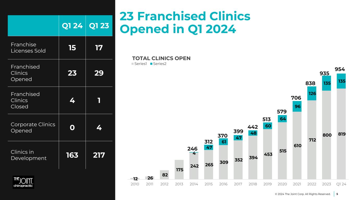 Overcoming Consumer Uncertainty ©2024 The Joint Corp All Rights Reserved 4© 2024 The Joint Corp. All Rights Reserved. 1 System-wide sales include revenues at all clinics, whether operated or managed by the company or by franchisees. While franchised sales are not recorded as revenues by the company, management believes the information is important in understanding the company’s financial performance, because these revenues are the basis on which the company calculates and records royalty fees and are indicative of the financial health of the franchisee base. | 2 System-wide comp sales include only the sales from clinics that have been open at least 13 or 48 full months and exclude any clinics that have permanently closed. | 3 Net income included the receipt of the employee retention credits of $3.9 million in Q1 2023. | 4 Reconciliation of Adjusted EBITDA to GAAP earnings is included in the Appendix. 9% Increase in system-wide sales 1 Q1 2024 over Q1 2023 3% Increase in system–wide comp sales 2 for all clinics >13 months in operation Q1 2024 over Q1 2023 (3)% Decrease in system–wide comp sales 2 for all clinics >48 months in operation Q1 2024 over Q1 2023 Q1 2024 Q1 2023 Revenue $29.7M $28.3M Op. Income/(Loss) $1.1M $(653)k Other Income 3 $35k $3.8M Net Income $947k $2.3M Adjusted EBITDA 4 $3.5M $2.0M Unrestricted cash $18.7M at Mar. 31, 2024, compared to $18.2M at Dec. 31, 2023