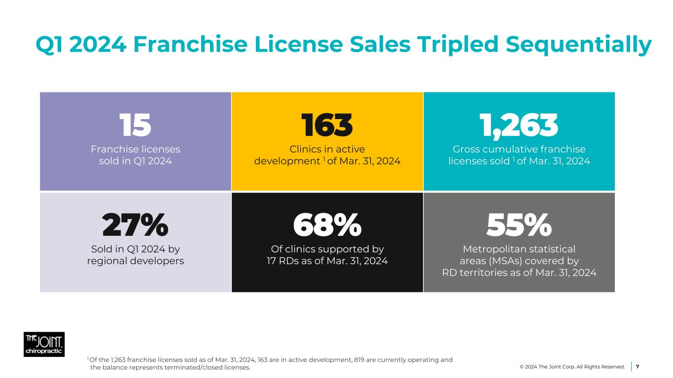 Refranchising Strategy Vast majority of corporate clinics: • Quality assets of value • Methodical clustering Vetting potential franchisees: • Engaging investment bank • Negotiating potential block transactions Value maximization: • Generates capital • Increases franchise revenue • Reduces corporate costs 6© 2024 The Joint Corp. All Rights Reserved.