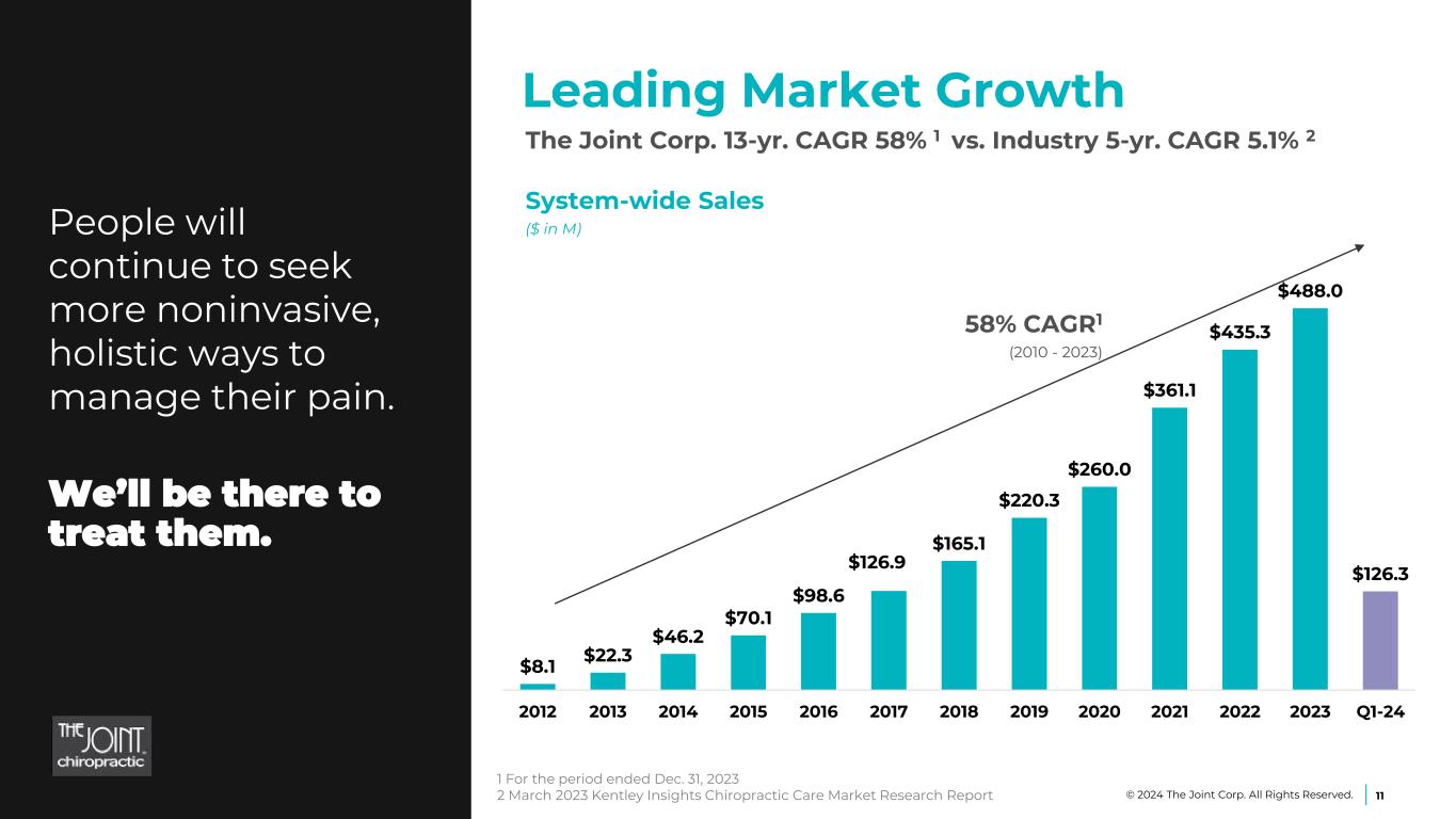 Reiterating 2024 Guidance $ in M 2023 Actual 2024 Low Guidance 2024 High Guidance System-wide sales 1 $488.0 $530 $545 System-wide comp sales for all clinics open 13 months or more 2 4% Mid-single digits New franchised clinic openings excluding the impact of refranchised clinics 104 60 75 10© 2024 The Joint Corp. All Rights Reserved. 1 System-wide sales include revenues at all clinics, whether operated or managed by the company or by franchisees. While franchised sales are not recorded as revenues by the company, management believes the information is important in understanding the company’s financial performance, because these revenues are the basis on which the company calculates and records royalty fees and are indicative of the financial health of the franchisee base. | 2 System-wide comp sales include only the sales from clinics that have been open at least 13 or 48 full months and exclude any clinics that have permanently closed..