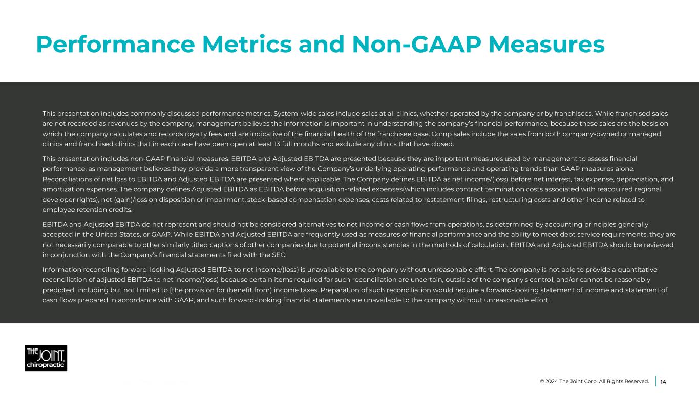 Performance Metrics and Non-GAAP Measures 14 This presentation includes commonly discussed performance metrics. System-wide sales include sales at all clinics, whether operated by the company or by franchisees. While franchised sales are not recorded as revenues by the company, management believes the information is important in understanding the company’s financial performance, because these sales are the basis on which the company calculates and records royalty fees and are indicative of the financial health of the franchisee base. Comp sales include the sales from both company-owned or managed clinics and franchised clinics that in each case have been open at least 13 full months and exclude any clinics that have closed. This presentation includes non-GAAP financial measures. EBITDA and Adjusted EBITDA are presented because they are important measures used by management to assess financial performance, as management believes they provide a more transparent view of the Company’s underlying operating performance and operating trends than GAAP measures alone. Reconciliations of net loss to EBITDA and Adjusted EBITDA are presented where applicable. The Company defines EBITDA as net income/(loss) before net interest, tax expense, depreciation, and amortization expenses. The company defines Adjusted EBITDA as EBITDA before acquisition-related expenses(which includes contract termination costs associated with reacquired regional developer rights), net (gain)/loss on disposition or impairment, stock-based compensation expenses, costs related to restatement filings, restructuring costs and other income related to employee retention credits. EBITDA and Adjusted EBITDA do not represent and should not be considered alternatives to net income or cash flows from operations, as determined by accounting principles generally accepted in the United States, or GAAP. While EBITDA and Adjusted EBITDA are frequently used as measures of financial performance and the ability to meet debt service requirements, they are not necessarily comparable to other similarly titled captions of other companies due to potential inconsistencies in the methods of calculation. EBITDA and Adjusted EBITDA should be reviewed in conjunction with the Company’s financial statements filed with the SEC. Information reconciling forward-looking Adjusted EBITDA to net income/(loss) is unavailable to the company without unreasonable effort. The company is not able to provide a quantitative reconciliation of adjusted EBITDA to net income/(loss) because certain items required for such reconciliation are uncertain, outside of the company's control, and/or cannot be reasonably predicted, including but not limited to [the provision for (benefit from) income taxes. Preparation of such reconciliation would require a forward-looking statement of income and statement of cash flows prepared in accordance with GAAP, and such forward-looking financial statements are unavailable to the company without unreasonable effort. © 2024 The Joint Corp. All Rights Reserved.