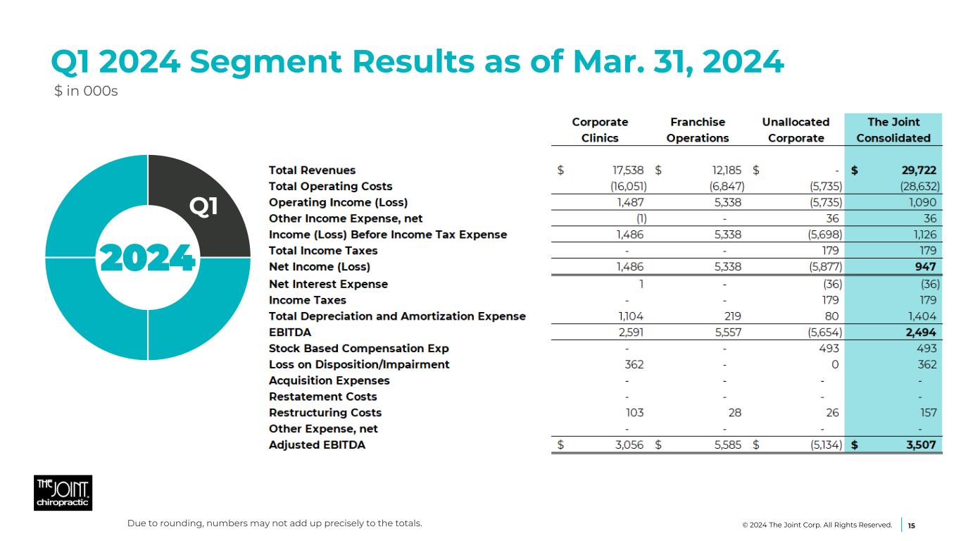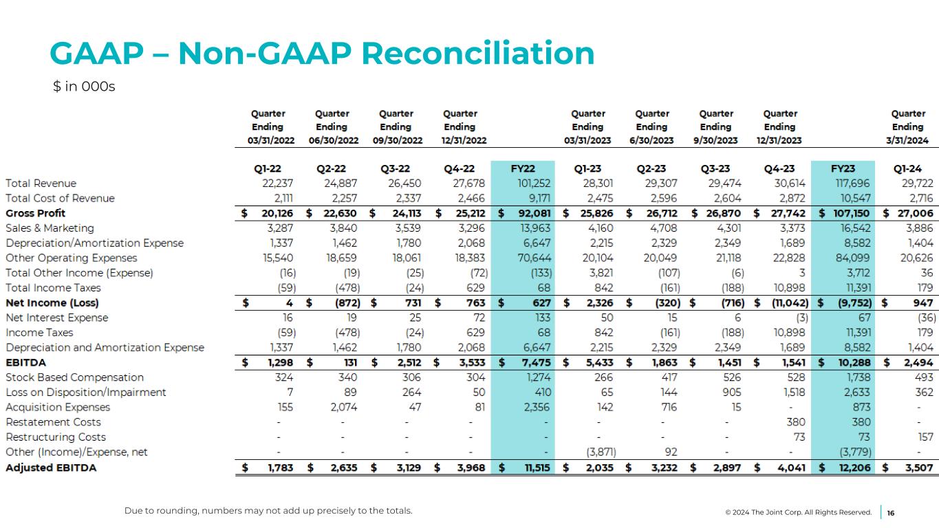Q1 2024 Segment Results as of Mar. 31, 2024 15 2024 Q1 © 2022 The Joint Corp. All Rights Reserved. $ in 000s 2024 The Joint Corp. All Rights Reserved.Due to rounding, numbers may not add up precisely to the totals.