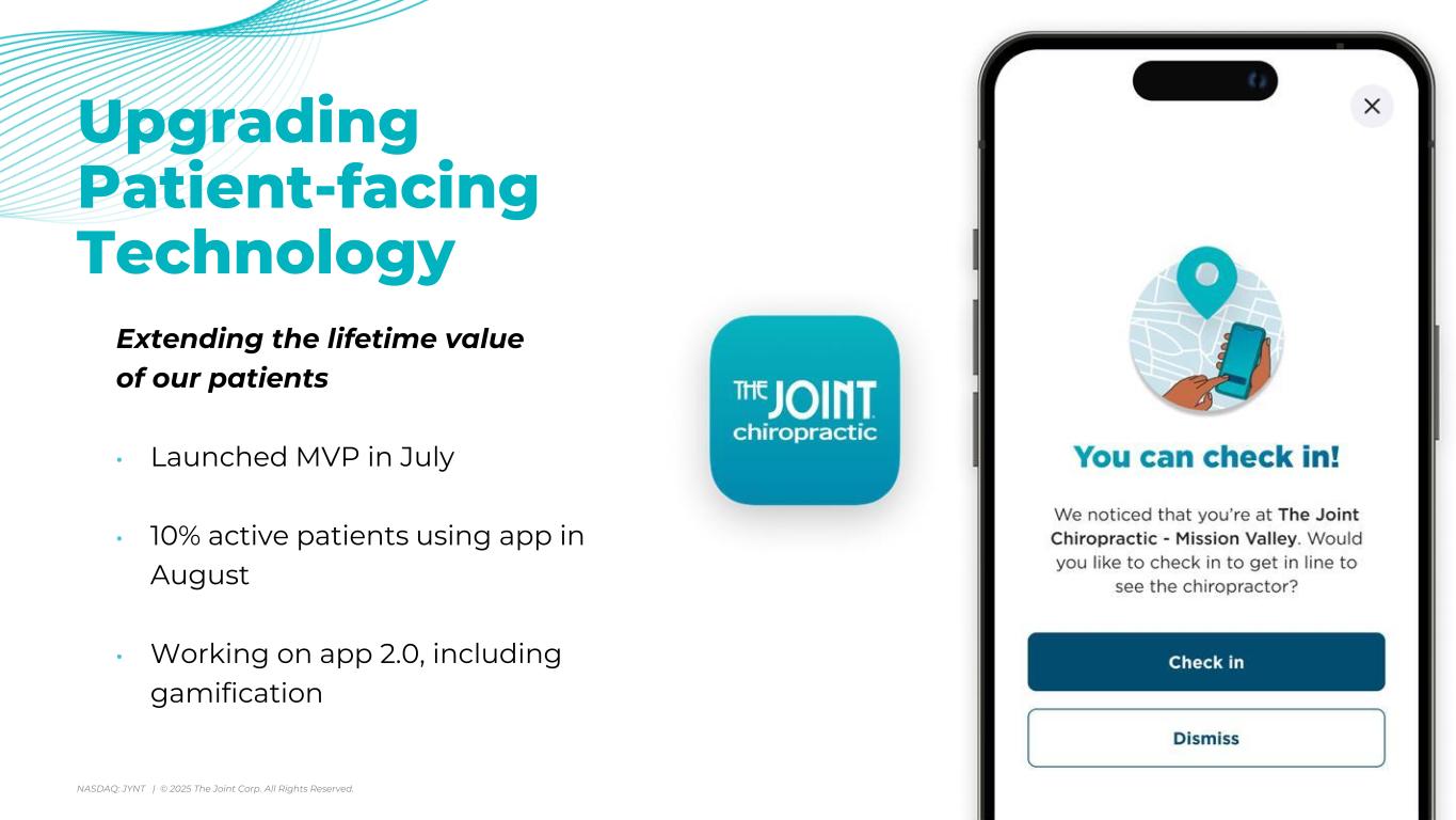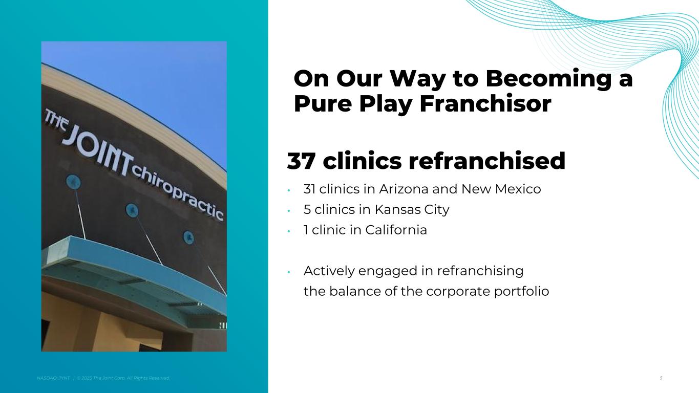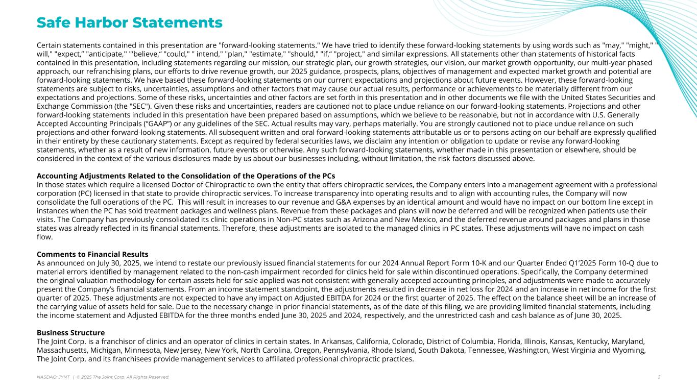 NASDAQ: JYNT | © 2025 The Joint Corp. All Rights Reserved. Safe Harbor Statements Certain statements contained in this presentation are "forward-looking statements." We have tried to identify these forward-looking statements by using words such as "may," "might," " will," "expect,” "anticipate,'' "'believe,“ "could," " intend," "plan," "estimate," "should," "if,“ "project," and similar expressions. All statements other than statements of historical facts contained in this presentation, including statements regarding our mission, our strategic plan, our growth strategies, our vision, our market growth opportunity, our multi-year phased approach, our refranchising plans, our efforts to drive revenue growth, our 2025 guidance, prospects, plans, objectives of management and expected market growth and potential are forward-looking statements. We have based these forward-looking statements on our current expectations and projections about future events. However, these forward-looking statements are subject to risks, uncertainties, assumptions and other factors that may cause our actual results, performance or achievements to be materially different from our expectations and projections. Some of these risks, uncertainties and other factors are set forth in this presentation and in other documents we file with the United States Securities and Exchange Commission (the "SEC"). Given these risks and uncertainties, readers are cautioned not to place undue reliance on our forward-looking statements. Projections and other forward-looking statements included in this presentation have been prepared based on assumptions, which we believe to be reasonable, but not in accordance with U.S. Generally Accepted Accounting Principals (“GAAP”) or any guidelines of the SEC. Actual results may vary, perhaps materially. You are strongly cautioned not to place undue reliance on such projections and other forward-looking statements. All subsequent written and oral forward-looking statements attributable us or to persons acting on our behalf are expressly qualified in their entirety by these cautionary statements. Except as required by federal securities laws, we disclaim any intention or obligation to update or revise any forward-looking statements, whether as a result of new information, future events or otherwise. Any such forward-looking statements, whether made in this presentation or elsewhere, should be considered in the context of the various disclosures made by us about our businesses including, without limitation, the risk factors discussed above. Accounting Adjustments Related to the Consolidation of the Operations of the PCs In those states which require a licensed Doctor of Chiropractic to own the entity that offers chiropractic services, the Company enters into a management agreement with a professional corporation (PC) licensed in that state to provide chiropractic services. To increase transparency into operating results and to align with accounting rules, the Company will now consolidate the full operations of the PC. This will result in increases to our revenue and G&A expenses by an identical amount and would have no impact on our bottom line except in instances when the PC has sold treatment packages and wellness plans. Revenue from these packages and plans will now be deferred and will be recognized when patients use their visits. The Company has previously consolidated its clinic operations in Non-PC states such as Arizona and New Mexico, and the deferred revenue around packages and plans in those states was already reflected in its financial statements. Therefore, these adjustments are isolated to the managed clinics in PC states. These adjustments will have no impact on cash flow. Comments to Financial Results As announced on July 30, 2025, we intend to restate our previously issued financial statements for our 2024 Annual Report Form 10-K and our Quarter Ended Q1’2025 Form 10-Q due to material errors identified by management related to the non-cash impairment recorded for clinics held for sale within discontinued operations. Specifically, the Company determined the original valuation methodology for certain assets held for sale applied was not consistent with generally accepted accounting principles, and adjustments were made to accurately present the Company’s financial statements. From an income statement standpoint, the adjustments resulted in decrease in net loss for 2024 and an increase in net income for the first quarter of 2025. These adjustments are not expected to have any impact on Adjusted EBITDA for 2024 or the first quarter of 2025. The effect on the balance sheet will be an increase of the carrying value of assets held for sale. Due to the necessary change in prior financial statements, as of the date of this filing, we are providing limited financial statements, including the income statement and Adjusted EBITDA for the three months ended June 30, 2025 and 2024, respectively, and the unrestricted cash and cash balance as of June 30, 2025. Business Structure The Joint Corp. is a franchisor of clinics and an operator of clinics in certain states. In Arkansas, California, Colorado, District of Columbia, Florida, Illinois, Kansas, Kentucky, Maryland, Massachusetts, Michigan, Minnesota, New Jersey, New York, North Carolina, Oregon, Pennsylvania, Rhode Island, South Dakota, Tennessee, Washington, West Virginia and Wyoming, The Joint Corp. and its franchisees provide management services to affiliated professional chiropractic practices. 2