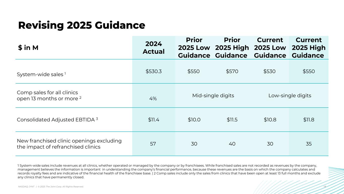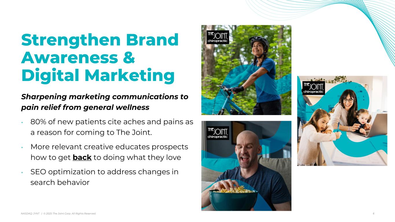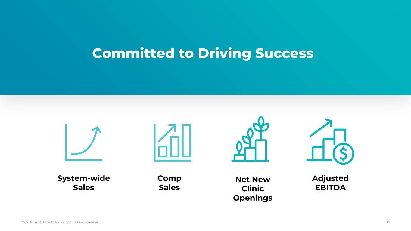 NASDAQ: JYNT | © 2025 The Joint Corp. All Rights Reserved. Safe Harbor Statements Certain statements contained in this presentation are "forward-looking statements." We have tried to identify these forward-looking statements by using words such as "may," "might," " will," "expect,” "anticipate,'' "'believe,“ "could," " intend," "plan," "estimate," "should," "if,“ "project," and similar expressions. All statements other than statements of historical facts contained in this presentation, including statements regarding our mission, our strategic plan, our growth strategies, our vision, our market growth opportunity, our multi-year phased approach, our refranchising plans, our efforts to drive revenue growth, our 2025 guidance, prospects, plans, objectives of management and expected market growth and potential are forward-looking statements. We have based these forward-looking statements on our current expectations and projections about future events. However, these forward-looking statements are subject to risks, uncertainties, assumptions and other factors that may cause our actual results, performance or achievements to be materially different from our expectations and projections. Some of these risks, uncertainties and other factors are set forth in this presentation and in other documents we file with the United States Securities and Exchange Commission (the "SEC"). Given these risks and uncertainties, readers are cautioned not to place undue reliance on our forward-looking statements. Projections and other forward-looking statements included in this presentation have been prepared based on assumptions, which we believe to be reasonable, but not in accordance with U.S. Generally Accepted Accounting Principals (“GAAP”) or any guidelines of the SEC. Actual results may vary, perhaps materially. You are strongly cautioned not to place undue reliance on such projections and other forward-looking statements. All subsequent written and oral forward-looking statements attributable us or to persons acting on our behalf are expressly qualified in their entirety by these cautionary statements. Except as required by federal securities laws, we disclaim any intention or obligation to update or revise any forward-looking statements, whether as a result of new information, future events or otherwise. Any such forward-looking statements, whether made in this presentation or elsewhere, should be considered in the context of the various disclosures made by us about our businesses including, without limitation, the risk factors discussed above. Accounting Adjustments Related to the Consolidation of the Operations of the PCs In those states which require a licensed Doctor of Chiropractic to own the entity that offers chiropractic services, the Company enters into a management agreement with a professional corporation (PC) licensed in that state to provide chiropractic services. To increase transparency into operating results and to align with accounting rules, the Company will now consolidate the full operations of the PC. This will result in increases to our revenue and G&A expenses by an identical amount and would have no impact on our bottom line except in instances when the PC has sold treatment packages and wellness plans. Revenue from these packages and plans will now be deferred and will be recognized when patients use their visits. The Company has previously consolidated its clinic operations in Non-PC states such as Arizona and New Mexico, and the deferred revenue around packages and plans in those states was already reflected in its financial statements. Therefore, these adjustments are isolated to the managed clinics in PC states. These adjustments will have no impact on cash flow. Comments to Financial Results As announced on July 30, 2025, we intend to restate our previously issued financial statements for our 2024 Annual Report Form 10-K and our Quarter Ended Q1’2025 Form 10-Q due to material errors identified by management related to the non-cash impairment recorded for clinics held for sale within discontinued operations. Specifically, the Company determined the original valuation methodology for certain assets held for sale applied was not consistent with generally accepted accounting principles, and adjustments were made to accurately present the Company’s financial statements. From an income statement standpoint, the adjustments resulted in decrease in net loss for 2024 and an increase in net income for the first quarter of 2025. These adjustments are not expected to have any impact on Adjusted EBITDA for 2024 or the first quarter of 2025. The effect on the balance sheet will be an increase of the carrying value of assets held for sale. Due to the necessary change in prior financial statements, as of the date of this filing, we are providing limited financial statements, including the income statement and Adjusted EBITDA for the three months ended June 30, 2025 and 2024, respectively, and the unrestricted cash and cash balance as of June 30, 2025. Business Structure The Joint Corp. is a franchisor of clinics and an operator of clinics in certain states. In Arkansas, California, Colorado, District of Columbia, Florida, Illinois, Kansas, Kentucky, Maryland, Massachusetts, Michigan, Minnesota, New Jersey, New York, North Carolina, Oregon, Pennsylvania, Rhode Island, South Dakota, Tennessee, Washington, West Virginia and Wyoming, The Joint Corp. and its franchisees provide management services to affiliated professional chiropractic practices. 2