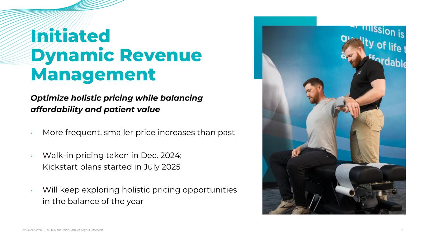 NASDAQ: JYNT | © 2025 The Joint Corp. All Rights Reserved. Strengthen Brand Awareness & Digital Marketing 6 Sharpening marketing communications to pain relief from general wellness • 80% of new patients cite aches and pains as a reason for coming to The Joint. • More relevant creative educates prospects how to get back to doing what they love • SEO optimization to address changes in search behavior