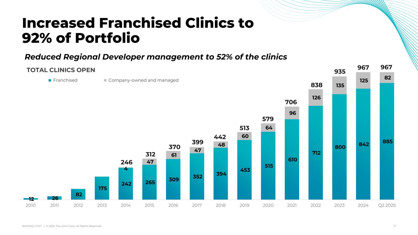 NASDAQ: JYNT | © 2025 The Joint Corp. All Rights Reserved. 12 26 82 175 242 265 309 352 394 453 515 610 712 800 842 885 4 47 61 47 48 60 64 96 126 135 125 82 2010 2011 2012 2013 2014 2015 2016 2017 2018 2019 2020 2021 2022 2023 2024 Q2 2025 TOTAL CLINICS OPEN Franchised Company-owned and managed Reduced Regional Developer management to 52% of the clinics Increased Franchised Clinics to 92% of Portfolio 370 399 442 513 312 246 579 706 838 935 967 11 967