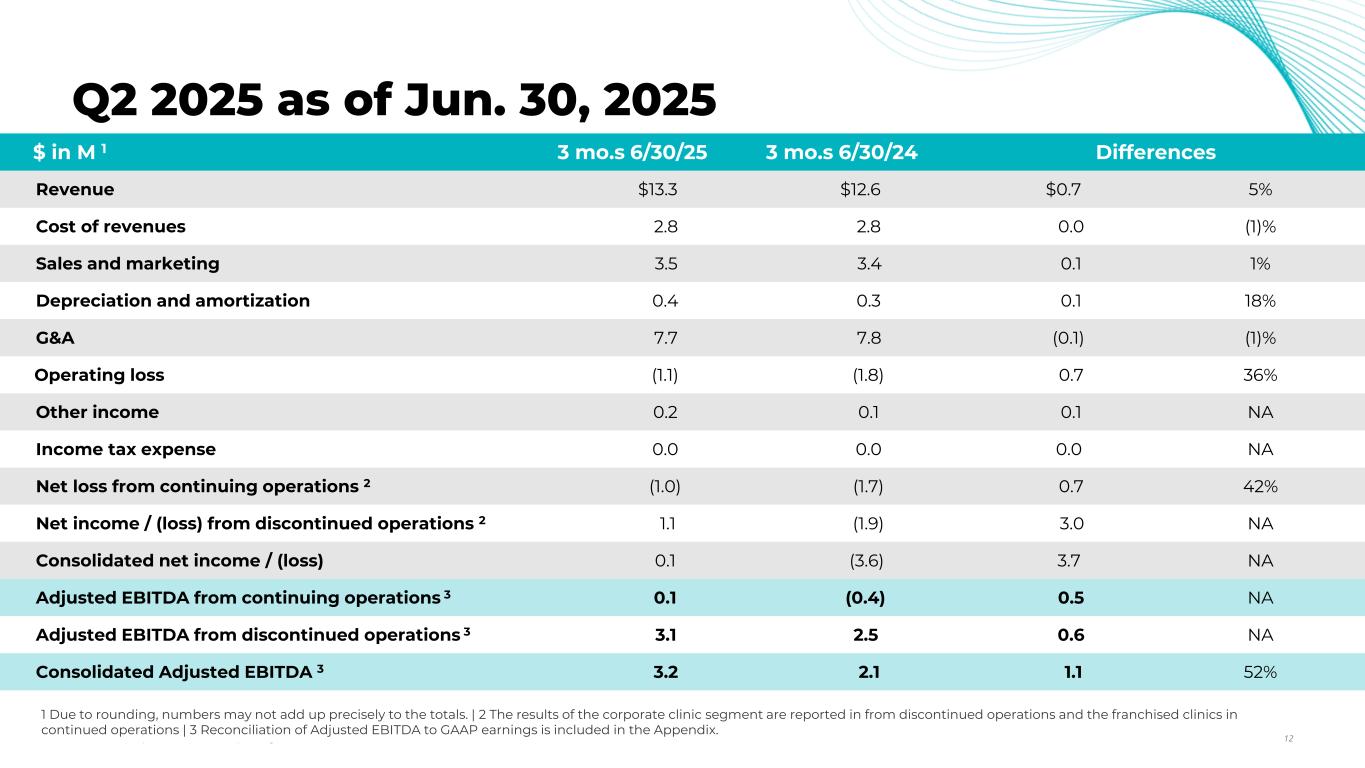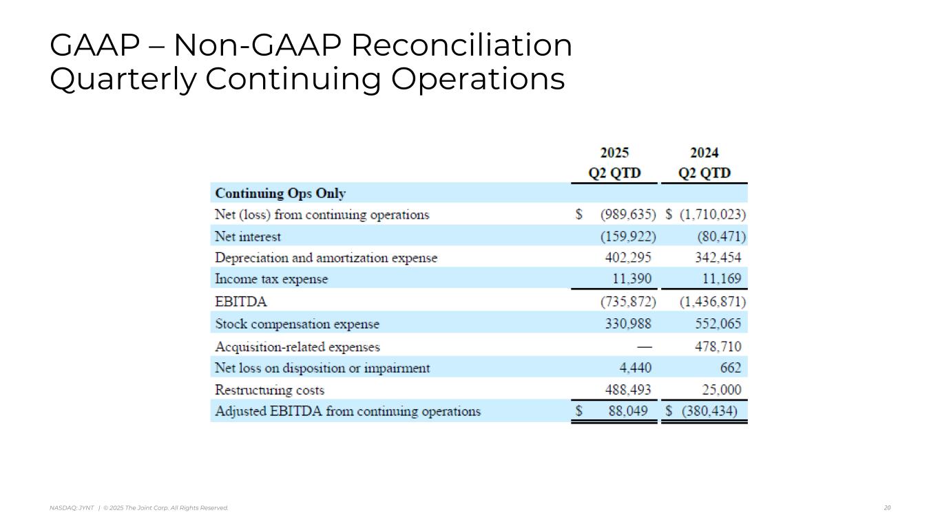NASDAQ: JYNT | © 2025 The Joint Corp. All Rights Reserved. 1 Due to rounding, numbers may not add up precisely to the totals. | 2 The results of the corporate clinic segment are reported in from discontinued operations and the franchised clinics in continued operations | 3 Reconciliation of Adjusted EBITDA to GAAP earnings is included in the Appendix. Q2 2025 as of Jun. 30, 2025 $ in M 1 3 mo.s 6/30/25 3 mo.s 6/30/24 Differences Revenue $13.3 $12.6 $0.7 5% Cost of revenues 2.8 2.8 0.0 (1)% Sales and marketing 3.5 3.4 0.1 1% Depreciation and amortization 0.4 0.3 0.1 18% G&A 7.7 7.8 (0.1) (1)% Operating loss (1.1) (1.8) 0.7 36% Other income 0.2 0.1 0.1 NA Income tax expense 0.0 0.0 0.0 NA Net loss from continuing operations 2 (1.0) (1.7) 0.7 42% Net income / (loss) from discontinued operations 2 1.1 (1.9) 3.0 NA Consolidated net income / (loss) 0.1 (3.6) 3.7 NA Adjusted EBITDA from continuing operations 3 0.1 (0.4) 0.5 NA Adjusted EBITDA from discontinued operations 3 3.1 2.5 0.6 NA Consolidated Adjusted EBITDA 3 3.2 2.1 1.1 52% 12
