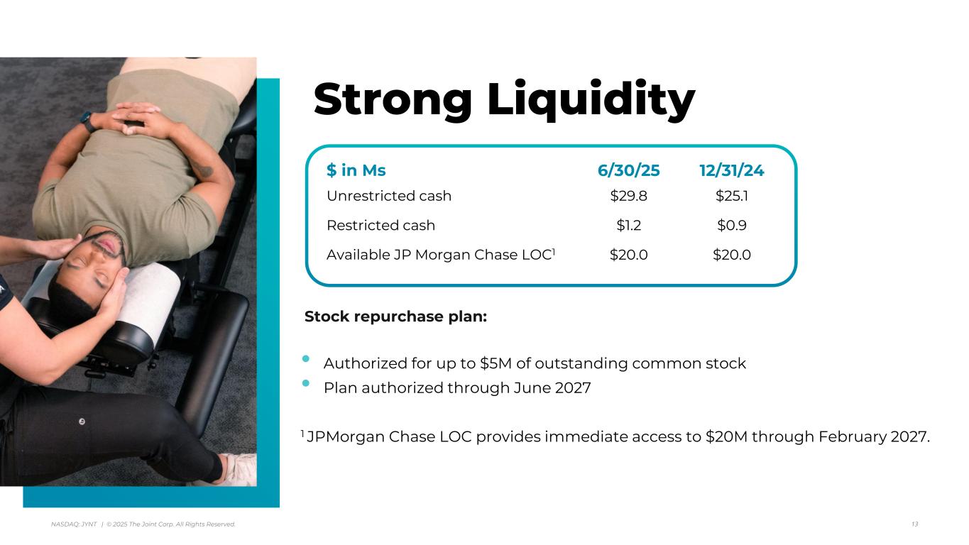 NASDAQ: JYNT | © 2025 The Joint Corp. All Rights Reserved. Stock repurchase plan: • Authorized for up to $5M of outstanding common stock • Plan authorized through June 2027 1 JPMorgan Chase LOC provides immediate access to $20M through February 2027. Strong Liquidity $ in Ms 6/30/25 12/31/24 Unrestricted cash $29.8 $25.1 Restricted cash $1.2 $0.9 Available JP Morgan Chase LOC1 $20.0 $20.0 13