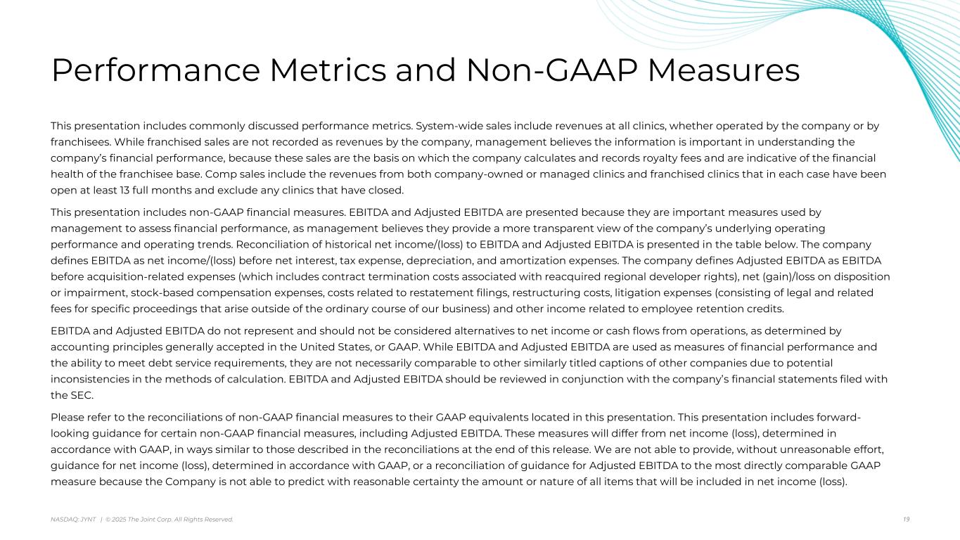 NASDAQ: JYNT | © 2025 The Joint Corp. All Rights Reserved. Performance Metrics and Non-GAAP Measures 19 This presentation includes commonly discussed performance metrics. System-wide sales include revenues at all clinics, whether operated by the company or by franchisees. While franchised sales are not recorded as revenues by the company, management believes the information is important in understanding the company’s financial performance, because these sales are the basis on which the company calculates and records royalty fees and are indicative of the financial health of the franchisee base. Comp sales include the revenues from both company-owned or managed clinics and franchised clinics that in each case have been open at least 13 full months and exclude any clinics that have closed. This presentation includes non-GAAP financial measures. EBITDA and Adjusted EBITDA are presented because they are important measures used by management to assess financial performance, as management believes they provide a more transparent view of the company’s underlying operating performance and operating trends. Reconciliation of historical net income/(loss) to EBITDA and Adjusted EBITDA is presented in the table below. The company defines EBITDA as net income/(loss) before net interest, tax expense, depreciation, and amortization expenses. The company defines Adjusted EBITDA as EBITDA before acquisition-related expenses (which includes contract termination costs associated with reacquired regional developer rights), net (gain)/loss on disposition or impairment, stock-based compensation expenses, costs related to restatement filings, restructuring costs, litigation expenses (consisting of legal and related fees for specific proceedings that arise outside of the ordinary course of our business) and other income related to employee retention credits. EBITDA and Adjusted EBITDA do not represent and should not be considered alternatives to net income or cash flows from operations, as determined by accounting principles generally accepted in the United States, or GAAP. While EBITDA and Adjusted EBITDA are used as measures of financial performance and the ability to meet debt service requirements, they are not necessarily comparable to other similarly titled captions of other companies due to potential inconsistencies in the methods of calculation. EBITDA and Adjusted EBITDA should be reviewed in conjunction with the company’s financial statements filed with the SEC. Please refer to the reconciliations of non-GAAP financial measures to their GAAP equivalents located in this presentation. This presentation includes forward- looking guidance for certain non-GAAP financial measures, including Adjusted EBITDA. These measures will differ from net income (loss), determined in accordance with GAAP, in ways similar to those described in the reconciliations at the end of this release. We are not able to provide, without unreasonable effort, guidance for net income (loss), determined in accordance with GAAP, or a reconciliation of guidance for Adjusted EBITDA to the most directly comparable GAAP measure because the Company is not able to predict with reasonable certainty the amount or nature of all items that will be included in net income (loss).