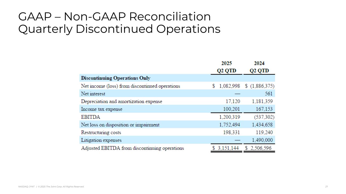NASDAQ: JYNT | © 2025 The Joint Corp. All Rights Reserved. GAAP – Non-GAAP Reconciliation Quarterly Continuing Operations 20