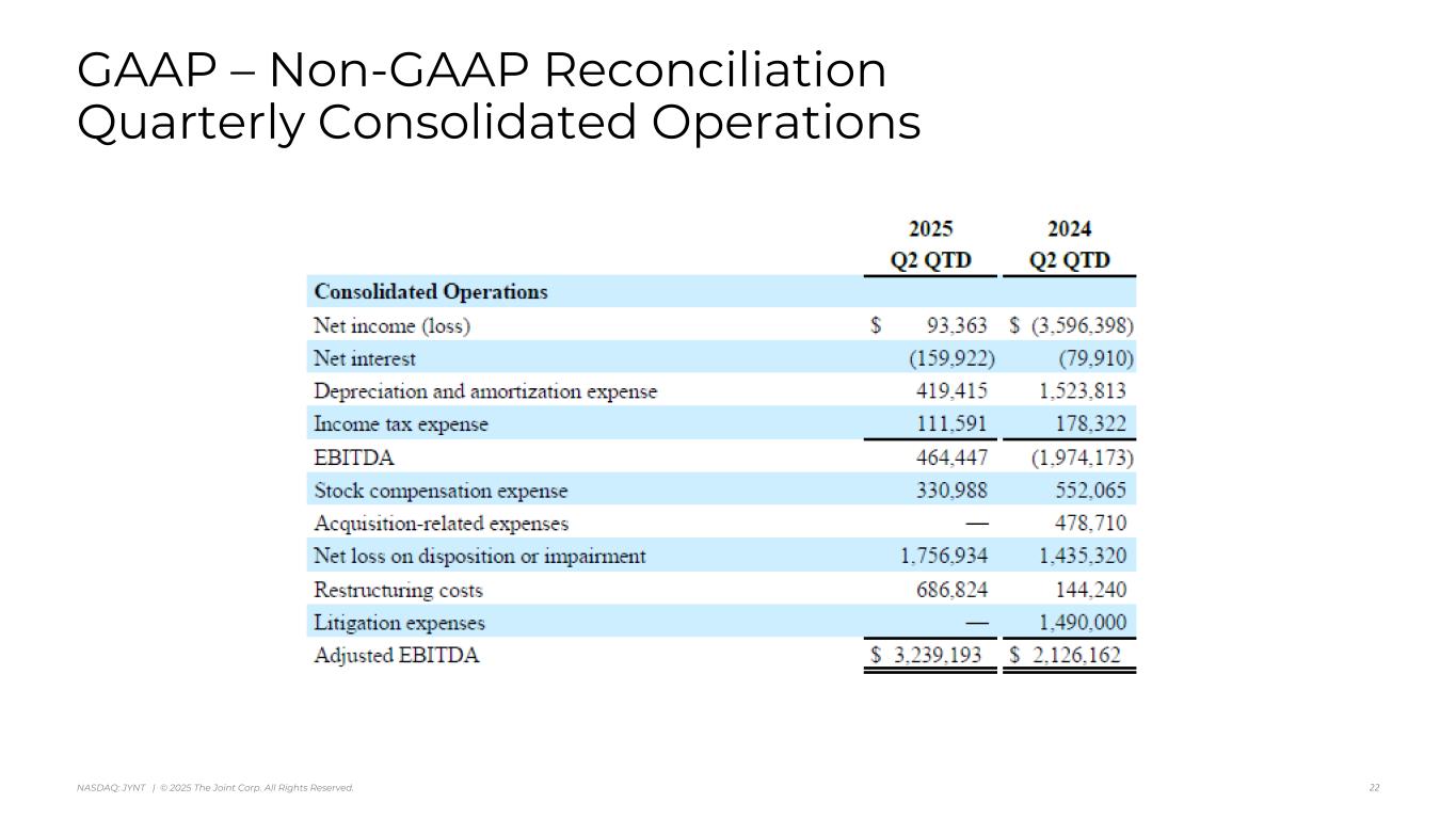 NASDAQ: JYNT | © 2025 The Joint Corp. All Rights Reserved. GAAP – Non-GAAP Reconciliation Quarterly Discontinued Operations 21