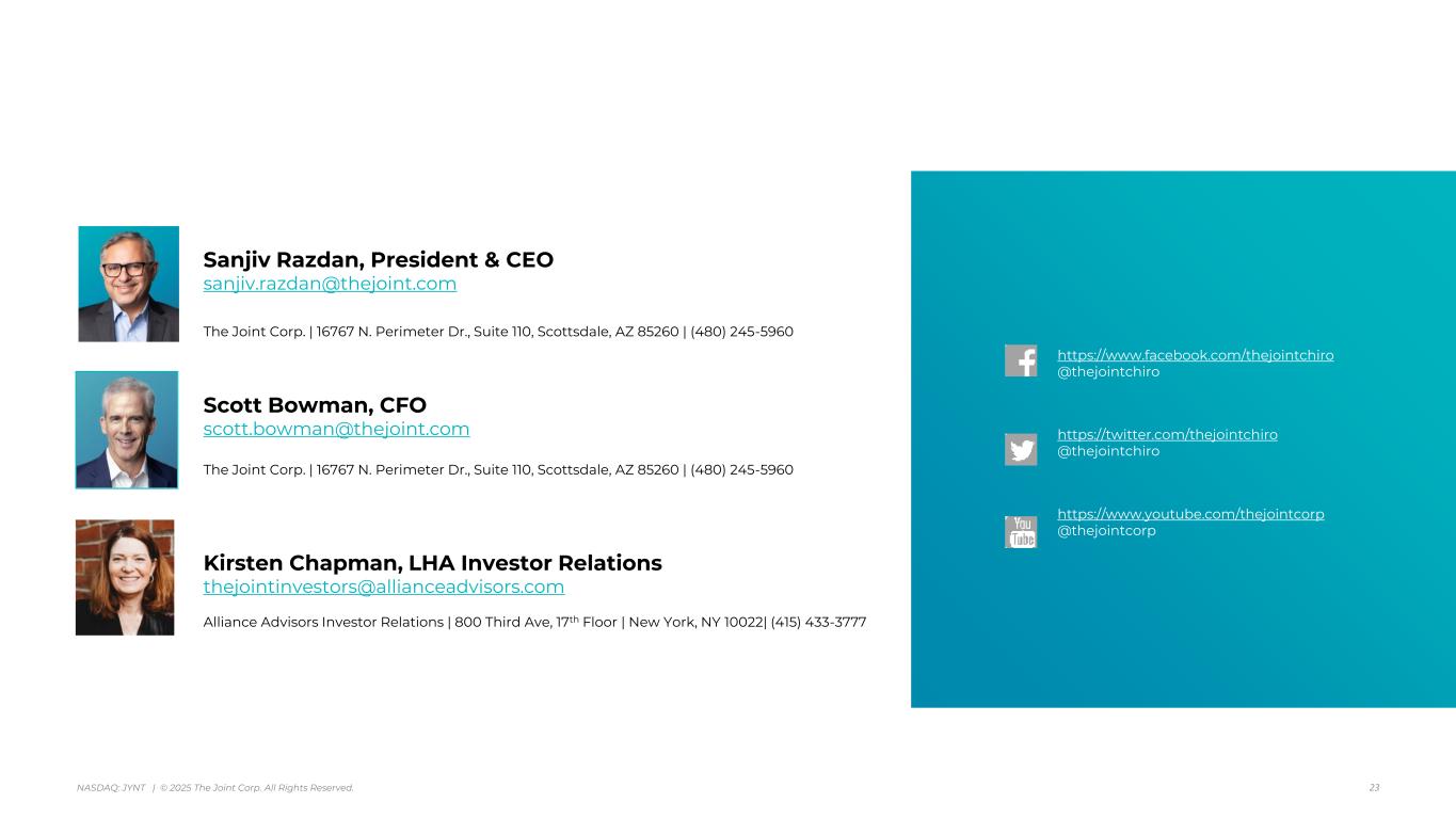 scott.bowman@thejoint.com Scott Bowman, CFO scott.bowman@thejoint.com The Joint Corp. | 16767 N. Perimeter Dr., Suite 110, Scottsdale, AZ 85260 | (480) 245-5960 https://www.facebook.com/thejointchiro https://twitter.com/thejointchiro https://www.youtube.com/thejointcorp https://www.facebook.com/thejointchiro @thejointchiro https://twitter.com/thejointchiro @thejointchiro https://www.youtube.com/thejointcorp @thejointcorp sanjiv.razdan@thejoint.com Sanjiv Razdan, President & CEO sanjiv.razdan@thejoint.com The Joint Corp. | 16767 N. Perimeter Dr., Suite 110, Scottsdale, AZ 85260 | (480) 245-5960 thejointinvestors@allianceadvisors.com Kirsten Chapman, LHA Investor Relations thejointinvestors@allianceadvisors.com Alliance Advisors Investor Relations | 800 Third Ave, 17th Floor | New York, NY 10022| (415) 433-3777 NASDAQ: JYNT | © 2025 The Joint Corp. All Rights Reserved. 23