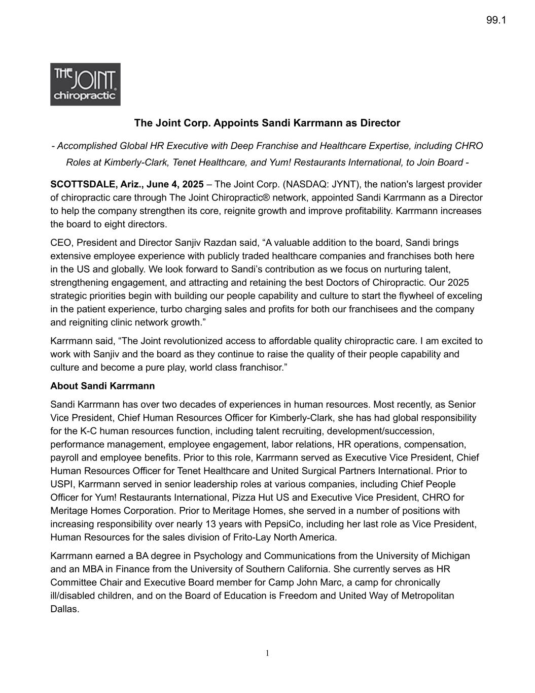 1 The Joint Corp. Appoints Sandi Karrmann as Director - Accomplished Global HR Executive with Deep Franchise and Healthcare Expertise, including CHRO Roles at Kimberly-Clark, Tenet Healthcare, and Yum! Restaurants International, to Join Board - SCOTTSDALE, Ariz., June 4, 2025 – The Joint Corp. (NASDAQ: JYNT), the nation's largest provider of chiropractic care through The Joint Chiropractic® network, appointed Sandi Karrmann as a Director to help the company strengthen its core, reignite growth and improve profitability. Karrmann increases the board to eight directors. CEO, President and Director Sanjiv Razdan said, “A valuable addition to the board, Sandi brings extensive employee experience with publicly traded healthcare companies and franchises both here in the US and globally. We look forward to Sandi’s contribution as we focus on nurturing talent, strengthening engagement, and attracting and retaining the best Doctors of Chiropractic. Our 2025 strategic priorities begin with building our people capability and culture to start the flywheel of exceling in the patient experience, turbo charging sales and profits for both our franchisees and the company and reigniting clinic network growth.” Karrmann said, “The Joint revolutionized access to affordable quality chiropractic care. I am excited to work with Sanjiv and the board as they continue to raise the quality of their people capability and culture and become a pure play, world class franchisor.” About Sandi Karrmann Sandi Karrmann has over two decades of experiences in human resources. Most recently, as Senior Vice President, Chief Human Resources Officer for Kimberly-Clark, she has had global responsibility for the K-C human resources function, including talent recruiting, development/succession, performance management, employee engagement, labor relations, HR operations, compensation, payroll and employee benefits. Prior to this role, Karrmann served as Executive Vice President, Chief Human Resources Officer for Tenet Healthcare and United Surgical Partners International. Prior to USPI, Karrmann served in senior leadership roles at various companies, including Chief People Officer for Yum! Restaurants International, Pizza Hut US and Executive Vice President, CHRO for Meritage Homes Corporation. Prior to Meritage Homes, she served in a number of positions with increasing responsibility over nearly 13 years with PepsiCo, including her last role as Vice President, Human Resources for the sales division of Frito-Lay North America. Karrmann earned a BA degree in Psychology and Communications from the University of Michigan and an MBA in Finance from the University of Southern California. She currently serves as HR Committee Chair and Executive Board member for Camp John Marc, a camp for chronically ill/disabled children, and on the Board of Education is Freedom and United Way of Metropolitan Dallas. 99.1