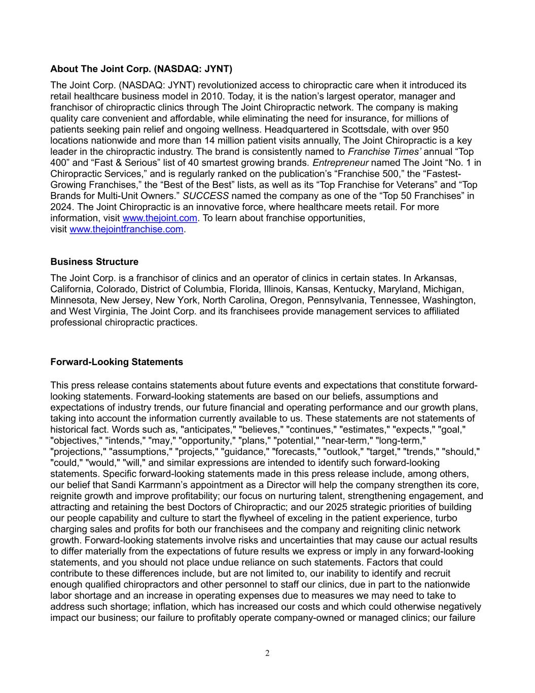 2 About The Joint Corp. (NASDAQ: JYNT) The Joint Corp. (NASDAQ: JYNT) revolutionized access to chiropractic care when it introduced its retail healthcare business model in 2010. Today, it is the nation’s largest operator, manager and franchisor of chiropractic clinics through The Joint Chiropractic network. The company is making quality care convenient and affordable, while eliminating the need for insurance, for millions of patients seeking pain relief and ongoing wellness. Headquartered in Scottsdale, with over 950 locations nationwide and more than 14 million patient visits annually, The Joint Chiropractic is a key leader in the chiropractic industry. The brand is consistently named to Franchise Times’ annual “Top 400” and “Fast & Serious” list of 40 smartest growing brands. Entrepreneur named The Joint “No. 1 in Chiropractic Services,” and is regularly ranked on the publication’s “Franchise 500,” the “Fastest- Growing Franchises,” the “Best of the Best” lists, as well as its “Top Franchise for Veterans” and “Top Brands for Multi-Unit Owners.” SUCCESS named the company as one of the “Top 50 Franchises” in 2024. The Joint Chiropractic is an innovative force, where healthcare meets retail. For more information, visit www.thejoint.com. To learn about franchise opportunities, visit www.thejointfranchise.com. Business Structure The Joint Corp. is a franchisor of clinics and an operator of clinics in certain states. In Arkansas, California, Colorado, District of Columbia, Florida, Illinois, Kansas, Kentucky, Maryland, Michigan, Minnesota, New Jersey, New York, North Carolina, Oregon, Pennsylvania, Tennessee, Washington, and West Virginia, The Joint Corp. and its franchisees provide management services to affiliated professional chiropractic practices. Forward-Looking Statements This press release contains statements about future events and expectations that constitute forward- looking statements. Forward-looking statements are based on our beliefs, assumptions and expectations of industry trends, our future financial and operating performance and our growth plans, taking into account the information currently available to us. These statements are not statements of historical fact. Words such as, "anticipates," "believes," "continues," "estimates," "expects," "goal," "objectives," "intends," "may," "opportunity," "plans," "potential," "near-term," "long-term," "projections," "assumptions," "projects," "guidance," "forecasts," "outlook," "target," "trends," "should," "could," "would," "will," and similar expressions are intended to identify such forward-looking statements. Specific forward-looking statements made in this press release include, among others, our belief that Sandi Karrmann’s appointment as a Director will help the company strengthen its core, reignite growth and improve profitability; our focus on nurturing talent, strengthening engagement, and attracting and retaining the best Doctors of Chiropractic; and our 2025 strategic priorities of building our people capability and culture to start the flywheel of exceling in the patient experience, turbo charging sales and profits for both our franchisees and the company and reigniting clinic network growth. Forward-looking statements involve risks and uncertainties that may cause our actual results to differ materially from the expectations of future results we express or imply in any forward-looking statements, and you should not place undue reliance on such statements. Factors that could contribute to these differences include, but are not limited to, our inability to identify and recruit enough qualified chiropractors and other personnel to staff our clinics, due in part to the nationwide labor shortage and an increase in operating expenses due to measures we may need to take to address such shortage; inflation, which has increased our costs and which could otherwise negatively impact our business; our failure to profitably operate company-owned or managed clinics; our failure