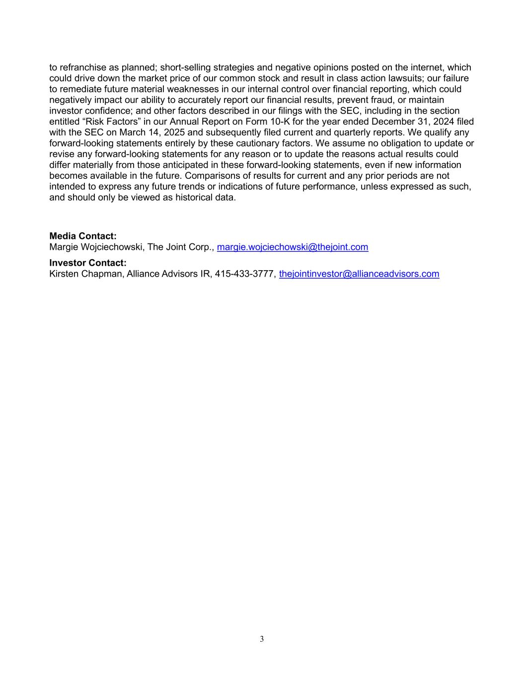 3 to refranchise as planned; short-selling strategies and negative opinions posted on the internet, which could drive down the market price of our common stock and result in class action lawsuits; our failure to remediate future material weaknesses in our internal control over financial reporting, which could negatively impact our ability to accurately report our financial results, prevent fraud, or maintain investor confidence; and other factors described in our filings with the SEC, including in the section entitled “Risk Factors” in our Annual Report on Form 10-K for the year ended December 31, 2024 filed with the SEC on March 14, 2025 and subsequently filed current and quarterly reports. We qualify any forward-looking statements entirely by these cautionary factors. We assume no obligation to update or revise any forward-looking statements for any reason or to update the reasons actual results could differ materially from those anticipated in these forward-looking statements, even if new information becomes available in the future. Comparisons of results for current and any prior periods are not intended to express any future trends or indications of future performance, unless expressed as such, and should only be viewed as historical data. Media Contact: Margie Wojciechowski, The Joint Corp., margie.wojciechowski@thejoint.com Investor Contact: Kirsten Chapman, Alliance Advisors IR, 415-433-3777, thejointinvestor@allianceadvisors.com