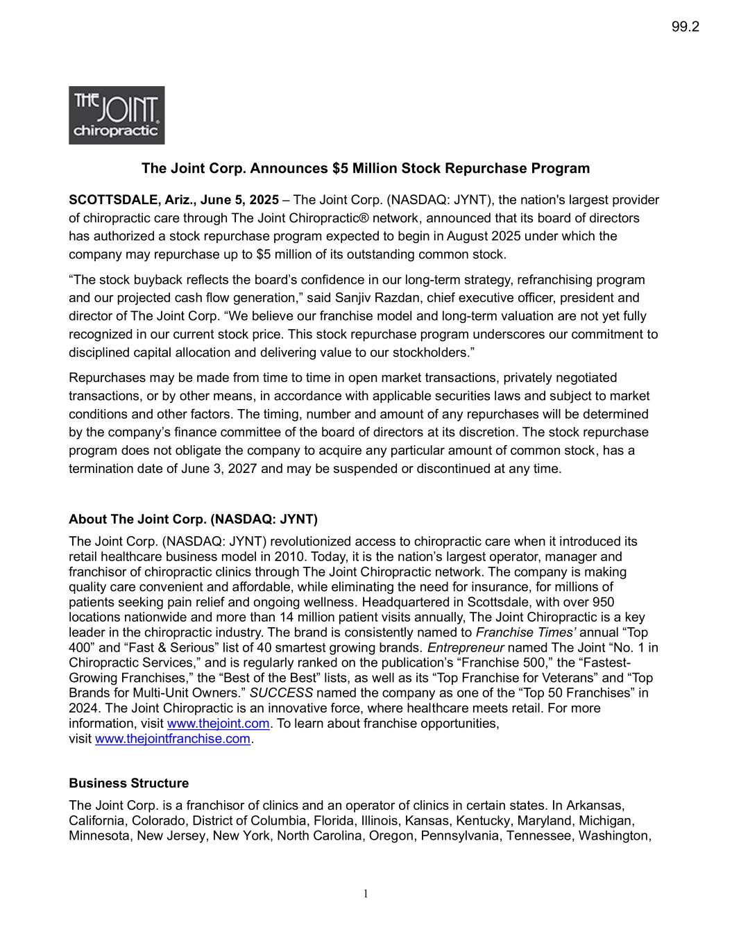 1 The Joint Corp. Announces $5 Million Stock Repurchase Program SCOTTSDALE, Ariz., June 5, 2025 – The Joint Corp. (NASDAQ: JYNT), the nation's largest provider of chiropractic care through The Joint Chiropractic® network, announced that its board of directors has authorized a stock repurchase program expected to begin in August 2025 under which the company may repurchase up to $5 million of its outstanding common stock. “The stock buyback reflects the board’s confidence in our long-term strategy, refranchising program and our projected cash flow generation,” said Sanjiv Razdan, chief executive officer, president and director of The Joint Corp. “We believe our franchise model and long-term valuation are not yet fully recognized in our current stock price. This stock repurchase program underscores our commitment to disciplined capital allocation and delivering value to our stockholders.” Repurchases may be made from time to time in open market transactions, privately negotiated transactions, or by other means, in accordance with applicable securities laws and subject to market conditions and other factors. The timing, number and amount of any repurchases will be determined by the company’s finance committee of the board of directors at its discretion. The stock repurchase program does not obligate the company to acquire any particular amount of common stock, has a termination date of June 3, 2027 and may be suspended or discontinued at any time. About The Joint Corp. (NASDAQ: JYNT) The Joint Corp. (NASDAQ: JYNT) revolutionized access to chiropractic care when it introduced its retail healthcare business model in 2010. Today, it is the nation’s largest operator, manager and franchisor of chiropractic clinics through The Joint Chiropractic network. The company is making quality care convenient and affordable, while eliminating the need for insurance, for millions of patients seeking pain relief and ongoing wellness. Headquartered in Scottsdale, with over 950 locations nationwide and more than 14 million patient visits annually, The Joint Chiropractic is a key leader in the chiropractic industry. The brand is consistently named to Franchise Times’ annual “Top 400” and “Fast & Serious” list of 40 smartest growing brands. Entrepreneur named The Joint “No. 1 in Chiropractic Services,” and is regularly ranked on the publication’s “Franchise 500,” the “Fastest- Growing Franchises,” the “Best of the Best” lists, as well as its “Top Franchise for Veterans” and “Top Brands for Multi-Unit Owners.” SUCCESS named the company as one of the “Top 50 Franchises” in 2024. The Joint Chiropractic is an innovative force, where healthcare meets retail. For more information, visit www.thejoint.com. To learn about franchise opportunities, visit www.thejointfranchise.com. Business Structure The Joint Corp. is a franchisor of clinics and an operator of clinics in certain states. In Arkansas, California, Colorado, District of Columbia, Florida, Illinois, Kansas, Kentucky, Maryland, Michigan, Minnesota, New Jersey, New York, North Carolina, Oregon, Pennsylvania, Tennessee, Washington, 99.2