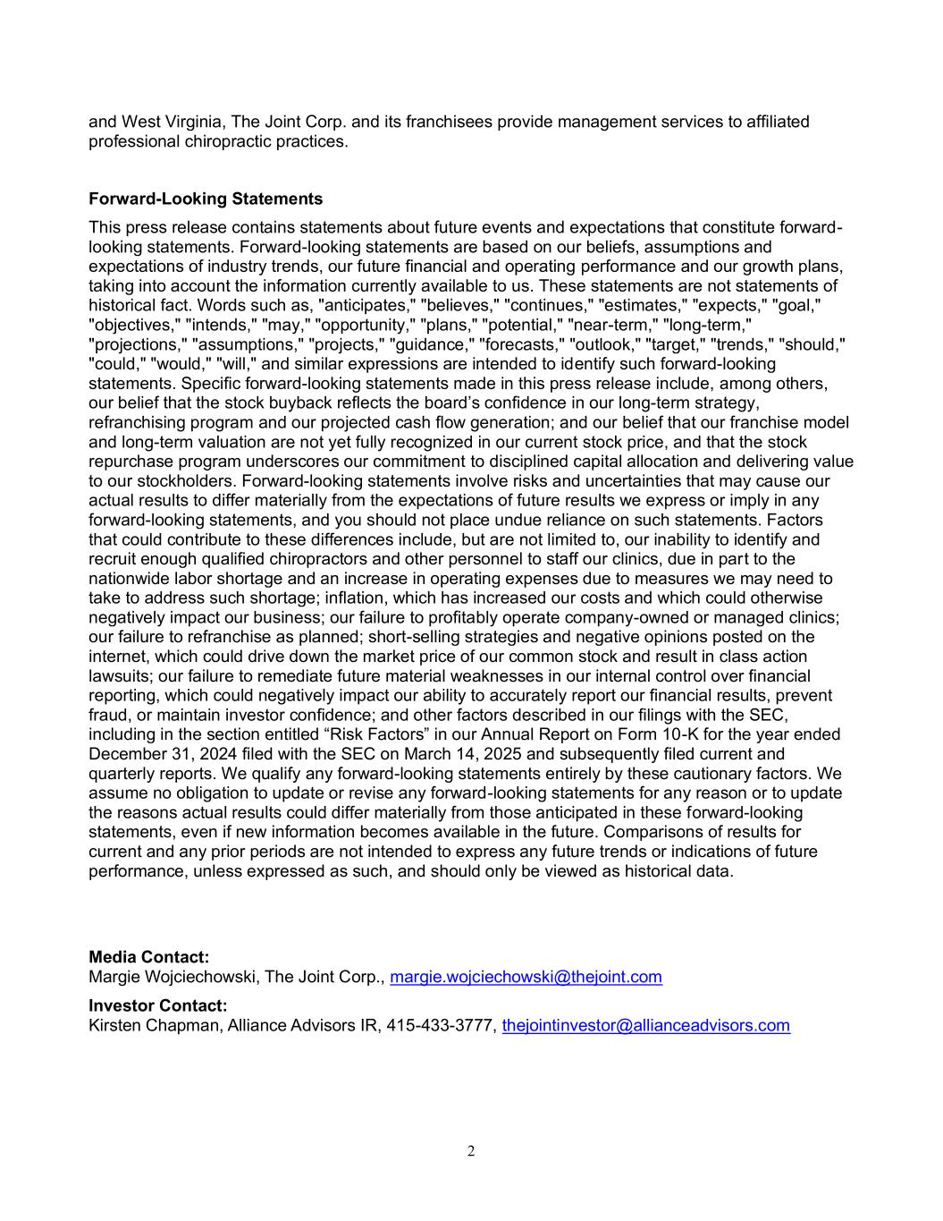 2 and West Virginia, The Joint Corp. and its franchisees provide management services to affiliated professional chiropractic practices. Forward-Looking Statements This press release contains statements about future events and expectations that constitute forward- looking statements. Forward-looking statements are based on our beliefs, assumptions and expectations of industry trends, our future financial and operating performance and our growth plans, taking into account the information currently available to us. These statements are not statements of historical fact. Words such as, "anticipates," "believes," "continues," "estimates," "expects," "goal," "objectives," "intends," "may," "opportunity," "plans," "potential," "near-term," "long-term," "projections," "assumptions," "projects," "guidance," "forecasts," "outlook," "target," "trends," "should," "could," "would," "will," and similar expressions are intended to identify such forward-looking statements. Specific forward-looking statements made in this press release include, among others, our belief that the stock buyback reflects the board’s confidence in our long-term strategy, refranchising program and our projected cash flow generation; and our belief that our franchise model and long-term valuation are not yet fully recognized in our current stock price, and that the stock repurchase program underscores our commitment to disciplined capital allocation and delivering value to our stockholders. Forward-looking statements involve risks and uncertainties that may cause our actual results to differ materially from the expectations of future results we express or imply in any forward-looking statements, and you should not place undue reliance on such statements. Factors that could contribute to these differences include, but are not limited to, our inability to identify and recruit enough qualified chiropractors and other personnel to staff our clinics, due in part to the nationwide labor shortage and an increase in operating expenses due to measures we may need to take to address such shortage; inflation, which has increased our costs and which could otherwise negatively impact our business; our failure to profitably operate company-owned or managed clinics; our failure to refranchise as planned; short-selling strategies and negative opinions posted on the internet, which could drive down the market price of our common stock and result in class action lawsuits; our failure to remediate future material weaknesses in our internal control over financial reporting, which could negatively impact our ability to accurately report our financial results, prevent fraud, or maintain investor confidence; and other factors described in our filings with the SEC, including in the section entitled “Risk Factors” in our Annual Report on Form 10-K for the year ended December 31, 2024 filed with the SEC on March 14, 2025 and subsequently filed current and quarterly reports. We qualify any forward-looking statements entirely by these cautionary factors. We assume no obligation to update or revise any forward-looking statements for any reason or to update the reasons actual results could differ materially from those anticipated in these forward-looking statements, even if new information becomes available in the future. Comparisons of results for current and any prior periods are not intended to express any future trends or indications of future performance, unless expressed as such, and should only be viewed as historical data. Media Contact: Margie Wojciechowski, The Joint Corp., margie.wojciechowski@thejoint.com Investor Contact: Kirsten Chapman, Alliance Advisors IR, 415-433-3777, thejointinvestor@allianceadvisors.com