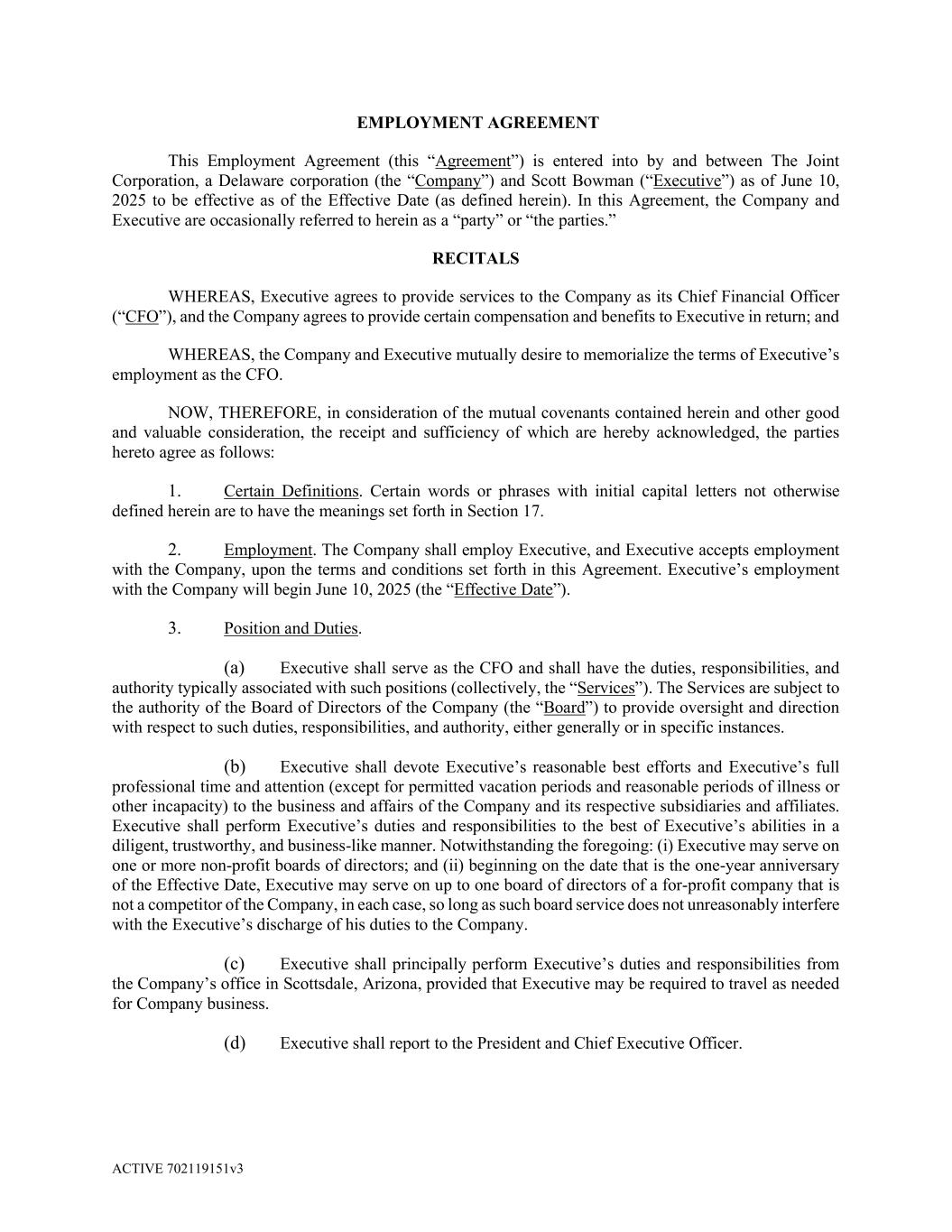 ACTIVE 702119151v3 EMPLOYMENT AGREEMENT This Employment Agreement (this “Agreement”) is entered into by and between The Joint Corporation, a Delaware corporation (the “Company”) and Scott Bowman (“Executive”) as of June 10, 2025 to be effective as of the Effective Date (as defined herein). In this Agreement, the Company and Executive are occasionally referred to herein as a “party” or “the parties.” RECITALS WHEREAS, Executive agrees to provide services to the Company as its Chief Financial Officer (“CFO”), and the Company agrees to provide certain compensation and benefits to Executive in return; and WHEREAS, the Company and Executive mutually desire to memorialize the terms of Executive’s employment as the CFO. NOW, THEREFORE, in consideration of the mutual covenants contained herein and other good and valuable consideration, the receipt and sufficiency of which are hereby acknowledged, the parties hereto agree as follows: 1. Certain Definitions. Certain words or phrases with initial capital letters not otherwise defined herein are to have the meanings set forth in Section 17. 2. Employment. The Company shall employ Executive, and Executive accepts employment with the Company, upon the terms and conditions set forth in this Agreement. Executive’s employment with the Company will begin June 10, 2025 (the “Effective Date”). 3. Position and Duties. (a) Executive shall serve as the CFO and shall have the duties, responsibilities, and authority typically associated with such positions (collectively, the “Services”). The Services are subject to the authority of the Board of Directors of the Company (the “Board”) to provide oversight and direction with respect to such duties, responsibilities, and authority, either generally or in specific instances. (b) Executive shall devote Executive’s reasonable best efforts and Executive’s full professional time and attention (except for permitted vacation periods and reasonable periods of illness or other incapacity) to the business and affairs of the Company and its respective subsidiaries and affiliates. Executive shall perform Executive’s duties and responsibilities to the best of Executive’s abilities in a diligent, trustworthy, and business-like manner. Notwithstanding the foregoing: (i) Executive may serve on one or more non-profit boards of directors; and (ii) beginning on the date that is the one-year anniversary of the Effective Date, Executive may serve on up to one board of directors of a for-profit company that is not a competitor of the Company, in each case, so long as such board service does not unreasonably interfere with the Executive’s discharge of his duties to the Company. (c) Executive shall principally perform Executive’s duties and responsibilities from the Company’s office in Scottsdale, Arizona, provided that Executive may be required to travel as needed for Company business. (d) Executive shall report to the President and Chief Executive Officer.