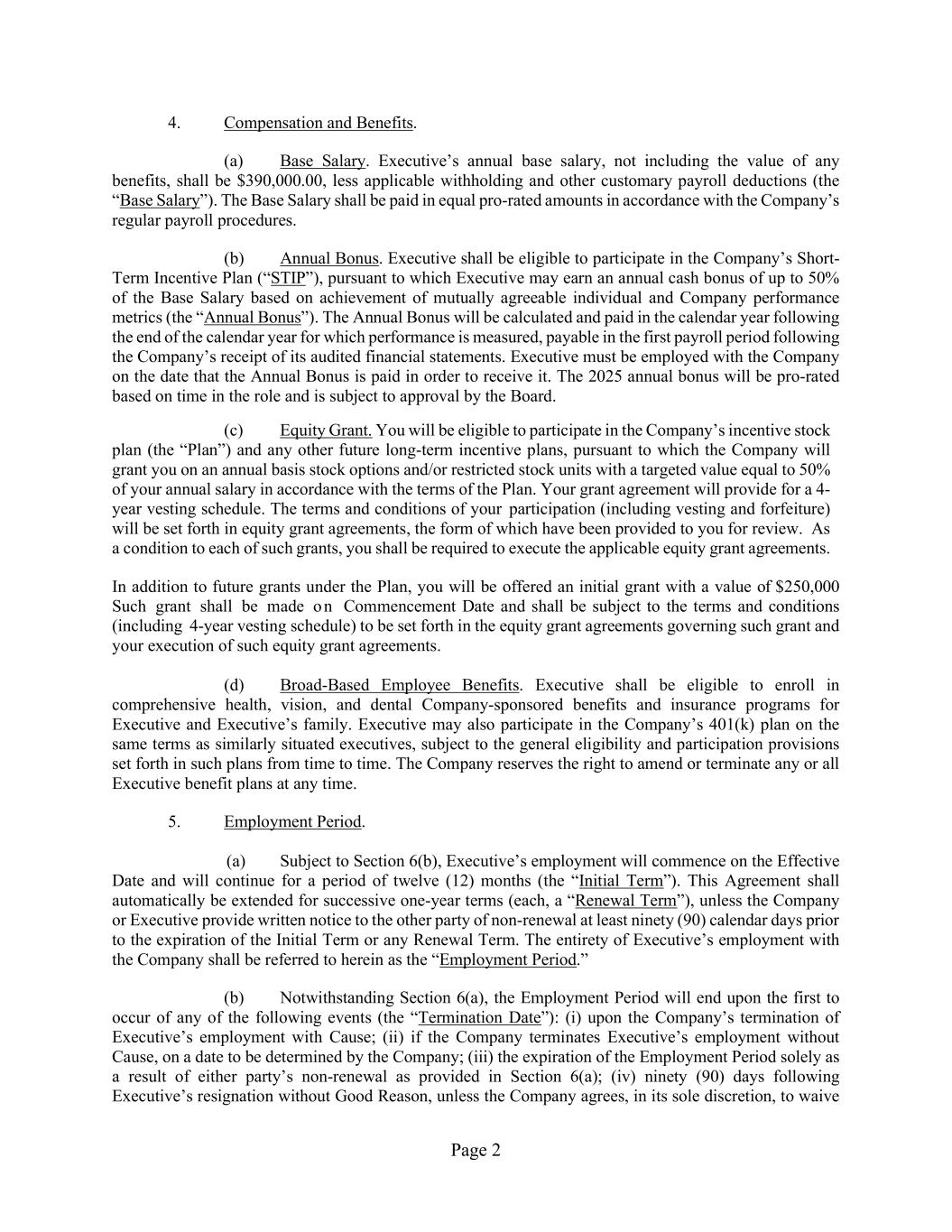 Page 2 4. Compensation and Benefits. (a) Base Salary. Executive’s annual base salary, not including the value of any benefits, shall be $390,000.00, less applicable withholding and other customary payroll deductions (the “Base Salary”). The Base Salary shall be paid in equal pro-rated amounts in accordance with the Company’s regular payroll procedures. (b) Annual Bonus. Executive shall be eligible to participate in the Company’s Short- Term Incentive Plan (“STIP”), pursuant to which Executive may earn an annual cash bonus of up to 50% of the Base Salary based on achievement of mutually agreeable individual and Company performance metrics (the “Annual Bonus”). The Annual Bonus will be calculated and paid in the calendar year following the end of the calendar year for which performance is measured, payable in the first payroll period following the Company’s receipt of its audited financial statements. Executive must be employed with the Company on the date that the Annual Bonus is paid in order to receive it. The 2025 annual bonus will be pro-rated based on time in the role and is subject to approval by the Board. (c) Equity Grant. You will be eligible to participate in the Company’s incentive stock plan (the “Plan”) and any other future long-term incentive plans, pursuant to which the Company will grant you on an annual basis stock options and/or restricted stock units with a targeted value equal to 50% of your annual salary in accordance with the terms of the Plan. Your grant agreement will provide for a 4- year vesting schedule. The terms and conditions of your participation (including vesting and forfeiture) will be set forth in equity grant agreements, the form of which have been provided to you for review. As a condition to each of such grants, you shall be required to execute the applicable equity grant agreements. In addition to future grants under the Plan, you will be offered an initial grant with a value of $250,000 Such grant shall be made on Commencement Date and shall be subject to the terms and conditions (including 4-year vesting schedule) to be set forth in the equity grant agreements governing such grant and your execution of such equity grant agreements. (d) Broad-Based Employee Benefits. Executive shall be eligible to enroll in comprehensive health, vision, and dental Company-sponsored benefits and insurance programs for Executive and Executive’s family. Executive may also participate in the Company’s 401(k) plan on the same terms as similarly situated executives, subject to the general eligibility and participation provisions set forth in such plans from time to time. The Company reserves the right to amend or terminate any or all Executive benefit plans at any time. 5. Employment Period. (a) Subject to Section 6(b), Executive’s employment will commence on the Effective Date and will continue for a period of twelve (12) months (the “Initial Term”). This Agreement shall automatically be extended for successive one-year terms (each, a “Renewal Term”), unless the Company or Executive provide written notice to the other party of non-renewal at least ninety (90) calendar days prior to the expiration of the Initial Term or any Renewal Term. The entirety of Executive’s employment with the Company shall be referred to herein as the “Employment Period.” (b) Notwithstanding Section 6(a), the Employment Period will end upon the first to occur of any of the following events (the “Termination Date”): (i) upon the Company’s termination of Executive’s employment with Cause; (ii) if the Company terminates Executive’s employment without Cause, on a date to be determined by the Company; (iii) the expiration of the Employment Period solely as a result of either party’s non-renewal as provided in Section 6(a); (iv) ninety (90) days following Executive’s resignation without Good Reason, unless the Company agrees, in its sole discretion, to waive
