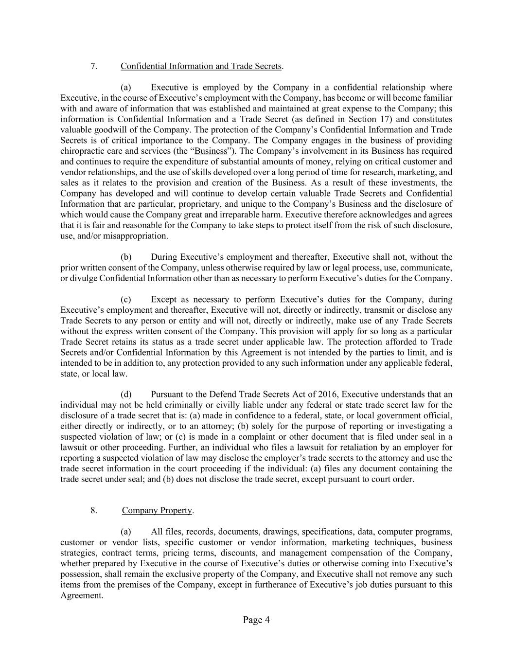 Page 4 7. Confidential Information and Trade Secrets. (a) Executive is employed by the Company in a confidential relationship where Executive, in the course of Executive’s employment with the Company, has become or will become familiar with and aware of information that was established and maintained at great expense to the Company; this information is Confidential Information and a Trade Secret (as defined in Section 17) and constitutes valuable goodwill of the Company. The protection of the Company’s Confidential Information and Trade Secrets is of critical importance to the Company. The Company engages in the business of providing chiropractic care and services (the “Business”). The Company’s involvement in its Business has required and continues to require the expenditure of substantial amounts of money, relying on critical customer and vendor relationships, and the use of skills developed over a long period of time for research, marketing, and sales as it relates to the provision and creation of the Business. As a result of these investments, the Company has developed and will continue to develop certain valuable Trade Secrets and Confidential Information that are particular, proprietary, and unique to the Company’s Business and the disclosure of which would cause the Company great and irreparable harm. Executive therefore acknowledges and agrees that it is fair and reasonable for the Company to take steps to protect itself from the risk of such disclosure, use, and/or misappropriation. (b) During Executive’s employment and thereafter, Executive shall not, without the prior written consent of the Company, unless otherwise required by law or legal process, use, communicate, or divulge Confidential Information other than as necessary to perform Executive’s duties for the Company. (c) Except as necessary to perform Executive’s duties for the Company, during Executive’s employment and thereafter, Executive will not, directly or indirectly, transmit or disclose any Trade Secrets to any person or entity and will not, directly or indirectly, make use of any Trade Secrets without the express written consent of the Company. This provision will apply for so long as a particular Trade Secret retains its status as a trade secret under applicable law. The protection afforded to Trade Secrets and/or Confidential Information by this Agreement is not intended by the parties to limit, and is intended to be in addition to, any protection provided to any such information under any applicable federal, state, or local law. (d) Pursuant to the Defend Trade Secrets Act of 2016, Executive understands that an individual may not be held criminally or civilly liable under any federal or state trade secret law for the disclosure of a trade secret that is: (a) made in confidence to a federal, state, or local government official, either directly or indirectly, or to an attorney; (b) solely for the purpose of reporting or investigating a suspected violation of law; or (c) is made in a complaint or other document that is filed under seal in a lawsuit or other proceeding. Further, an individual who files a lawsuit for retaliation by an employer for reporting a suspected violation of law may disclose the employer’s trade secrets to the attorney and use the trade secret information in the court proceeding if the individual: (a) files any document containing the trade secret under seal; and (b) does not disclose the trade secret, except pursuant to court order. 8. Company Property. (a) All files, records, documents, drawings, specifications, data, computer programs, customer or vendor lists, specific customer or vendor information, marketing techniques, business strategies, contract terms, pricing terms, discounts, and management compensation of the Company, whether prepared by Executive in the course of Executive’s duties or otherwise coming into Executive’s possession, shall remain the exclusive property of the Company, and Executive shall not remove any such items from the premises of the Company, except in furtherance of Executive’s job duties pursuant to this Agreement.