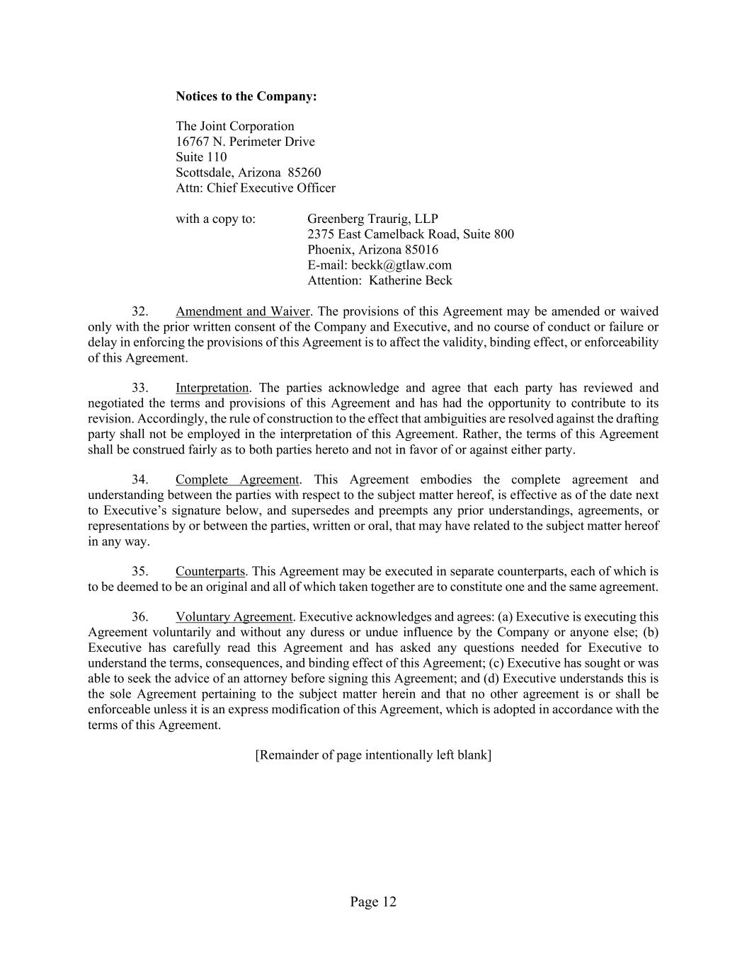 Page 12 Notices to the Company: The Joint Corporation 16767 N. Perimeter Drive Suite 110 Scottsdale, Arizona 85260 Attn: Chief Executive Officer with a copy to: Greenberg Traurig, LLP 2375 East Camelback Road, Suite 800 Phoenix, Arizona 85016 E-mail: beckk@gtlaw.com Attention: Katherine Beck 32. Amendment and Waiver. The provisions of this Agreement may be amended or waived only with the prior written consent of the Company and Executive, and no course of conduct or failure or delay in enforcing the provisions of this Agreement is to affect the validity, binding effect, or enforceability of this Agreement. 33. Interpretation. The parties acknowledge and agree that each party has reviewed and negotiated the terms and provisions of this Agreement and has had the opportunity to contribute to its revision. Accordingly, the rule of construction to the effect that ambiguities are resolved against the drafting party shall not be employed in the interpretation of this Agreement. Rather, the terms of this Agreement shall be construed fairly as to both parties hereto and not in favor of or against either party. 34. Complete Agreement. This Agreement embodies the complete agreement and understanding between the parties with respect to the subject matter hereof, is effective as of the date next to Executive’s signature below, and supersedes and preempts any prior understandings, agreements, or representations by or between the parties, written or oral, that may have related to the subject matter hereof in any way. 35. Counterparts. This Agreement may be executed in separate counterparts, each of which is to be deemed to be an original and all of which taken together are to constitute one and the same agreement. 36. Voluntary Agreement. Executive acknowledges and agrees: (a) Executive is executing this Agreement voluntarily and without any duress or undue influence by the Company or anyone else; (b) Executive has carefully read this Agreement and has asked any questions needed for Executive to understand the terms, consequences, and binding effect of this Agreement; (c) Executive has sought or was able to seek the advice of an attorney before signing this Agreement; and (d) Executive understands this is the sole Agreement pertaining to the subject matter herein and that no other agreement is or shall be enforceable unless it is an express modification of this Agreement, which is adopted in accordance with the terms of this Agreement. [Remainder of page intentionally left blank]