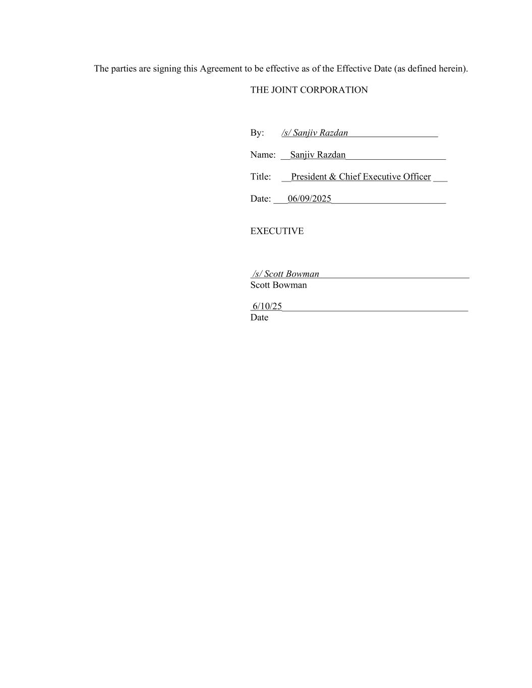 The parties are signing this Agreement to be effective as of the Effective Date (as defined herein). THE JOINT CORPORATION By: /s/ Sanjiv Razdan Name: __Sanjiv Razdan_____________________ Title: __President & Chief Executive Officer ___ Date: ___06/09/2025________________________ EXECUTIVE /s/ Scott Bowman Scott Bowman 6/10/25_______________________________________ Date