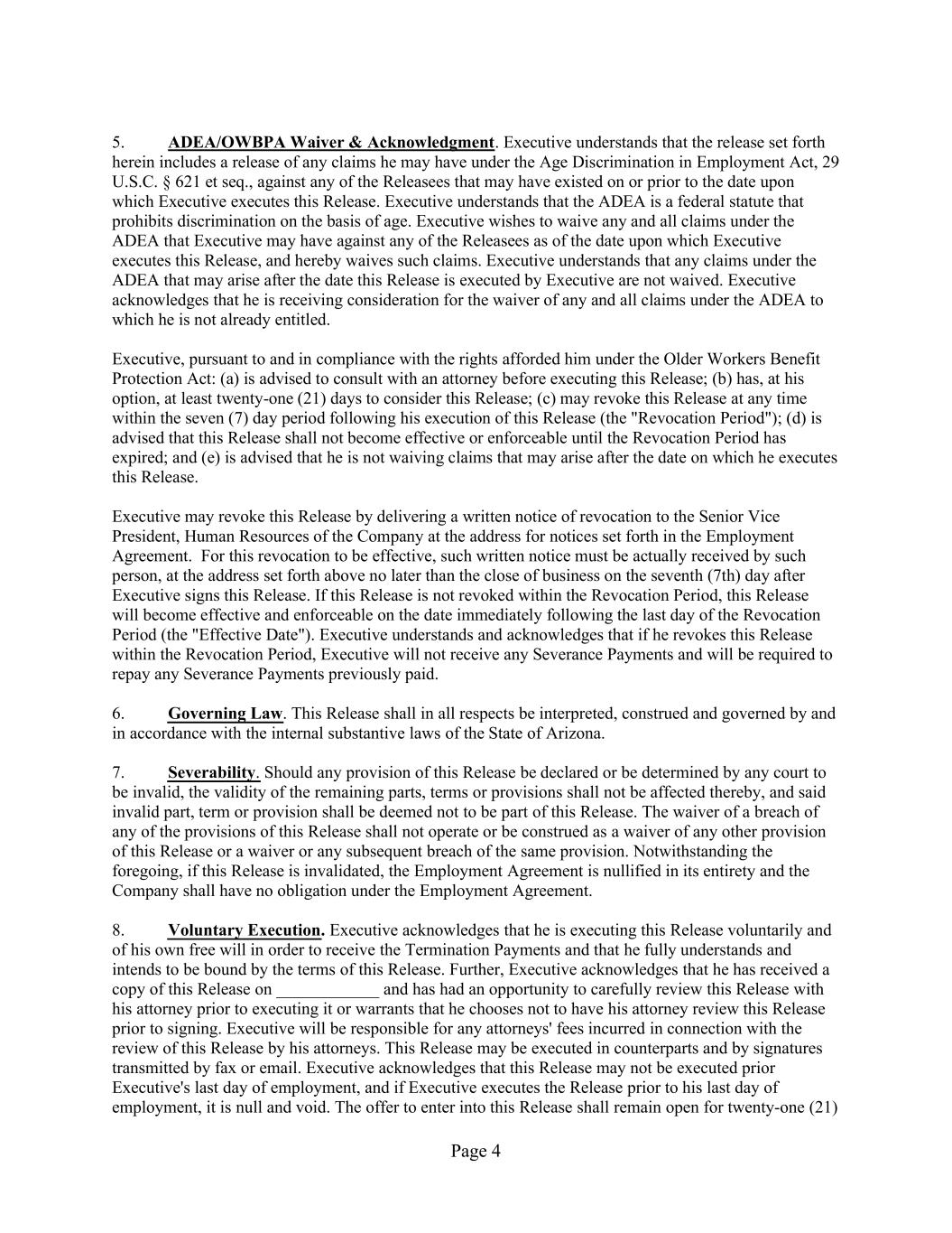 Page 4 5. ADEA/OWBPA Waiver & Acknowledgment. Executive understands that the release set forth herein includes a release of any claims he may have under the Age Discrimination in Employment Act, 29 U.S.C. § 621 et seq., against any of the Releasees that may have existed on or prior to the date upon which Executive executes this Release. Executive understands that the ADEA is a federal statute that prohibits discrimination on the basis of age. Executive wishes to waive any and all claims under the ADEA that Executive may have against any of the Releasees as of the date upon which Executive executes this Release, and hereby waives such claims. Executive understands that any claims under the ADEA that may arise after the date this Release is executed by Executive are not waived. Executive acknowledges that he is receiving consideration for the waiver of any and all claims under the ADEA to which he is not already entitled. Executive, pursuant to and in compliance with the rights afforded him under the Older Workers Benefit Protection Act: (a) is advised to consult with an attorney before executing this Release; (b) has, at his option, at least twenty-one (21) days to consider this Release; (c) may revoke this Release at any time within the seven (7) day period following his execution of this Release (the "Revocation Period"); (d) is advised that this Release shall not become effective or enforceable until the Revocation Period has expired; and (e) is advised that he is not waiving claims that may arise after the date on which he executes this Release. Executive may revoke this Release by delivering a written notice of revocation to the Senior Vice President, Human Resources of the Company at the address for notices set forth in the Employment Agreement. For this revocation to be effective, such written notice must be actually received by such person, at the address set forth above no later than the close of business on the seventh (7th) day after Executive signs this Release. If this Release is not revoked within the Revocation Period, this Release will become effective and enforceable on the date immediately following the last day of the Revocation Period (the "Effective Date"). Executive understands and acknowledges that if he revokes this Release within the Revocation Period, Executive will not receive any Severance Payments and will be required to repay any Severance Payments previously paid. 6. Governing Law. This Release shall in all respects be interpreted, construed and governed by and in accordance with the internal substantive laws of the State of Arizona. 7. Severability. Should any provision of this Release be declared or be determined by any court to be invalid, the validity of the remaining parts, terms or provisions shall not be affected thereby, and said invalid part, term or provision shall be deemed not to be part of this Release. The waiver of a breach of any of the provisions of this Release shall not operate or be construed as a waiver of any other provision of this Release or a waiver or any subsequent breach of the same provision. Notwithstanding the foregoing, if this Release is invalidated, the Employment Agreement is nullified in its entirety and the Company shall have no obligation under the Employment Agreement. 8. Voluntary Execution. Executive acknowledges that he is executing this Release voluntarily and of his own free will in order to receive the Termination Payments and that he fully understands and intends to be bound by the terms of this Release. Further, Executive acknowledges that he has received a copy of this Release on ____________ and has had an opportunity to carefully review this Release with his attorney prior to executing it or warrants that he chooses not to have his attorney review this Release prior to signing. Executive will be responsible for any attorneys' fees incurred in connection with the review of this Release by his attorneys. This Release may be executed in counterparts and by signatures transmitted by fax or email. Executive acknowledges that this Release may not be executed prior Executive's last day of employment, and if Executive executes the Release prior to his last day of employment, it is null and void. The offer to enter into this Release shall remain open for twenty-one (21)