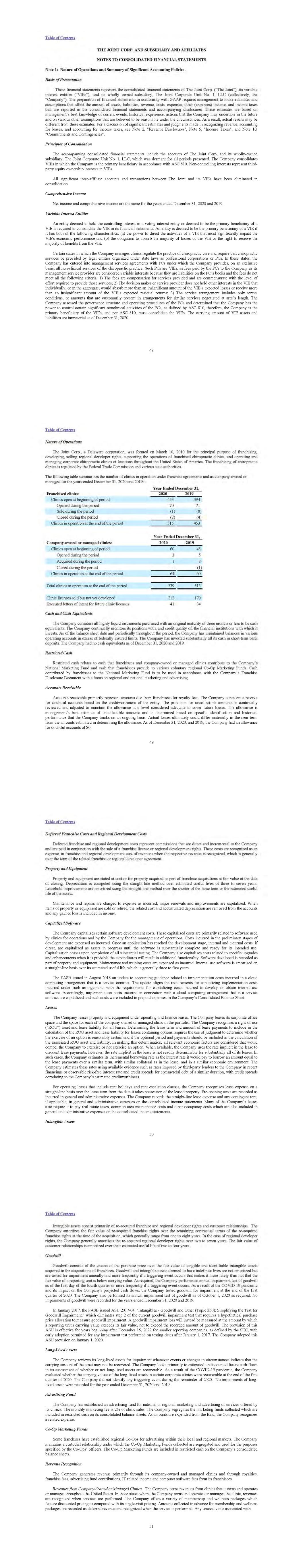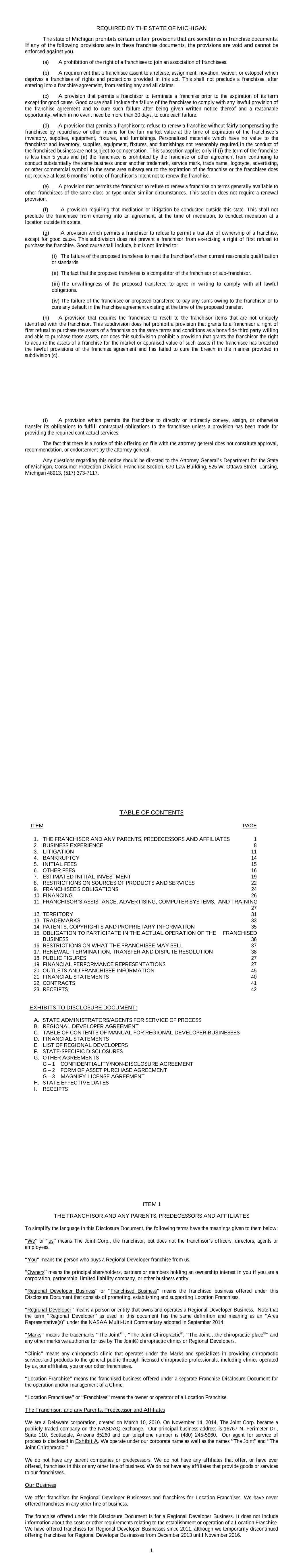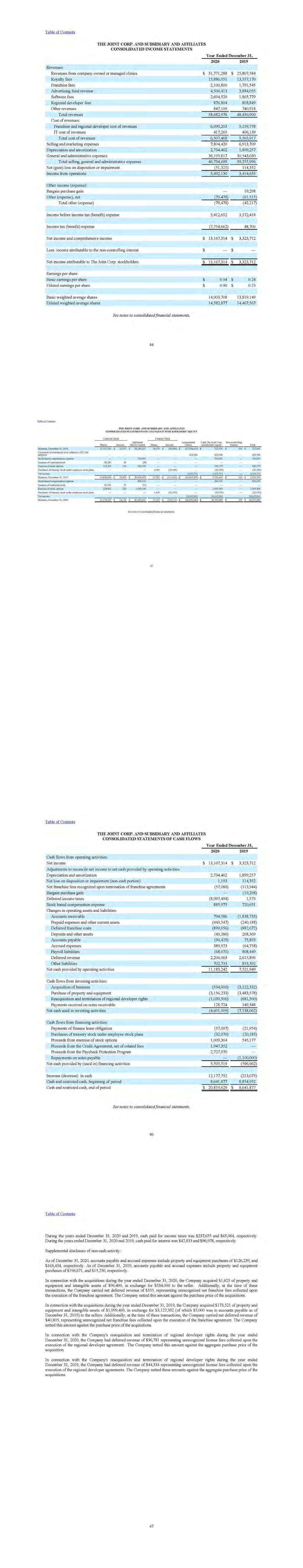 46 ITEM 21 FINANCIAL STATEMENTS Attached to this Disclosure Document as Exhibit D are: 1) our consolidated audited financial statements for the fiscal years ended December 31, 2020 and 2019, which have been taken from Item 8 of our 10-K Annual Report for 2020; 2) our consolidated audited financial statements for the fiscal years ended December 31, 2019 and 2018, which have been taken from Item 8 of our 10-K Annual Report for 2019. . 47 ITEM 22 CONTRACTS The following agreements are attached to this Disclosure Document: Exhibit B Regional Developer Agreement (which includes the following exhibits) Exhibit G – 1 Confidentiality/Non-Disclosure Agreement Exhibit G – 2 Form of Asset Purchase Agreement Exhibit G – 3 Magnify License Agreement The following exhibits and agreements are attached to this Regional Developer Agreement: Exhibit 1 Development Area Exhibit 2 Minimum Development Obligations Exhibit 3 Ownership Structure Exhibit 4 Owner's Guaranty and Assumption of Obligations Exhibit 5 State-Specific Addenda Exhibit 6 Regional Developer Questionnaire 48 ITEM 23 RECEIPTS Exhibit I includes Receipts acknowledging that you received this Disclosure Document. Please return one Receipt to us and retain the other for your records. If you are missing these Receipts, please contact us at this address or telephone number: The Joint Corp. 16767 N. Perimeter Dr., Suite 110 Scottsdale, Arizona 85260 Telephone (480) 245-5960 www.thejoint.com EXHIBIT A STATE ADMINISTRATORS/AGENTS FOR SERVICE OF PROCESS