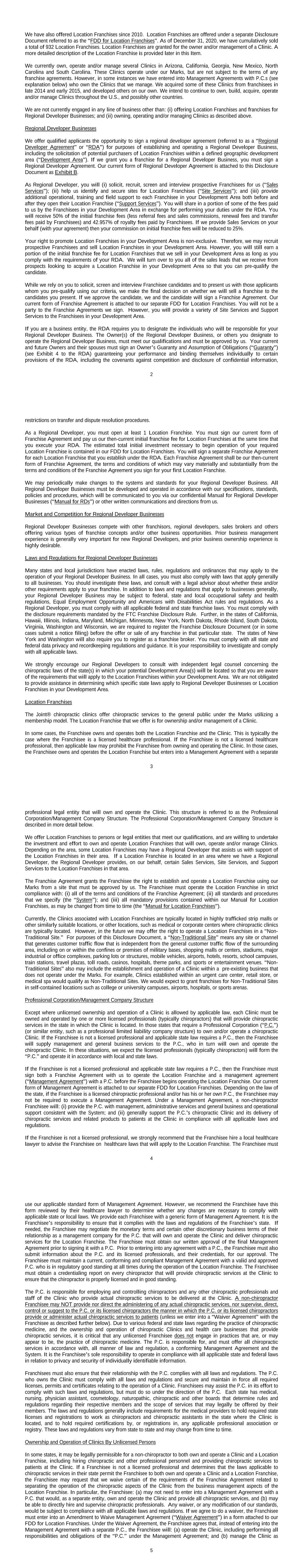 THE JOINT ® – RD FDD 2021 FRANCHISE DISCLOSURE DOCUMENT The Joint Corp. 16767 N. Perimeter Dr., Suite 110 Scottsdale, Arizona 85260 Telephone (480) 245-5960 Website: www.thejoint.com Email: eric.simon@thejoint.com This disclosure document is for the right to own and operate a Regional Developer Business in which you will be responsible for promoting, establishing and supporting Location Franchises which operate and/or manage chiropractic clinics (“Clinic(s)”) that specialize in providing chiropractic services to the general public at a specific location under the trademarks “The Joint®”, “The Joint® Chiropractic™, and other marks we authorize. The term “Regional Developer” or “Regional Developers”, mean a person or entity that operates one or several Regional Developer Businesses. Note that the term “Regional Developer(s)” as used in this document has the same definition and meaning as an “Area Representative(s)” under the new NASAA Multi-Unit Commentary adopted in September 2014. Each Location Franchise will report to and receive support directly and indirectly from you and/or our corporate headquarters. Location Franchises are offered under a separate disclosure document (“FDD for Location Franchises”). The estimated total initial investment necessary to begin operations of your Regional Developer Business will range from $166,225 to $551,350. This amount includes a Development Fee ranging from $150,000 to $500,000 that must be paid to the franchisor or an affiliate. Each Regional Developer Business must open at least one Location Franchise. The estimated total initial investment necessary to begin operations of a Location Franchise is contained in our FDD for Location Franchises. This disclosure document (“Disclosure Document”) summarizes certain provisions of your Regional Developer Agreement and other information in plain English. Read this Disclosure Document and all accompanying agreements carefully. You must receive this Disclosure Document at least fourteen (14) calendar days before you sign a binding agreement with, or make any payment to, us or an affiliate in connection with the proposed franchise sale. Note, however, that no government agency has verified the information contained in this document. You may wish to receive your Disclosure Document in another format that is more convenient for you. To discuss the availability of disclosures in different formats, contact Eric Simon, The Joint Corp., 16767 N. Perimeter Dr., Suite 110, Scottsdale, AZ 85260, (480) 245-5960. The terms of your contract will govern your franchise relationship. Don’t rely on the Disclosure Document alone to understand your contract. Read your entire contract carefully. Show your contract and this Disclosure Document to an advisor, like a lawyer or accountant. Buying a franchise is a complex investment. The information in this Disclosure Document can help you make up your mind. More information on franchising, such as “A Consumer’s Guide to Buying a Franchise,” which can help you understand how to use this disclosure document is available from the Federal Trade Commission. You can contact the FTC at 1-877-FTC-HELP or by writing to the FTC at 600 Pennsylvania Avenue NW, Washington, DC 20580. You can also visit the FTC’s home page at www.ftc.gov for additional information on franchising. Call your state agency or visit your public library for other sources of information on franchising. There may be laws on franchising in your state. Ask your state agencies about them. Issuance Date: April 29, 2021 Franchise Disclosure Document (2021) i How to Use this Franchise Disclosure Document Here are some questions you may be asking about buying a franchise and tips on how to find more information: QUESTION WHERE TO FIND INFORMATION How much can I earn? Item 19 may give you information about outlet sales, costs, profits or losses. You should also try to obtain this information from others, like current and former franchisees. You can find their names and contact information in Item 20 or Exhibit E. How much will I need to invest? Items 5 and 6 list fees you will be paying to the franchisor or at the franchisor’s direction. Item 7 lists the initial investment to open. Item 8 describes the suppliers you must use. Does the franchisor have the financial ability to provide support to my business? Item 21 or Exhibit D includes financial statements. Review these statements carefully. Is the franchise system stable, growing, or shrinking? Item 20 summarizes the recent history of the number of company-owned and franchised outlets. Will my business be the only The Joint® Regional Developer Business in my area? Item 12 and the “territory” provisions in the franchise agreement describe whether the franchisor and other franchisees can compete with you. Does the franchisor have a troubled legal history? Items 3 and 4 tell you whether the franchisor or its management have been involved in material litigation or bankruptcy proceedings. What’s it like to be a The Joint® Regional Developer Business franchisee? Item 20 or Exhibit E lists current and former franchisees. You can contact them to ask about their experiences. What else should I know? These questions are only a few things you should look for. Review all 23 Items and all Exhibits in this disclosure document to better understand this franchise opportunity. See the table of contents. Franchise Disclosure Document (2021) i What You Need To Know About Franchising Generally Continuing responsibility to pay fees. You may have to pay royalties and other fees even if you are losing money. Business model can change. The franchise agreement may allow the franchisor to change its manuals and business model without your consent. These changes may require you to make additional investments in your franchise business or may harm your franchise business. Supplier restrictions. You may have to buy or lease items from the franchi